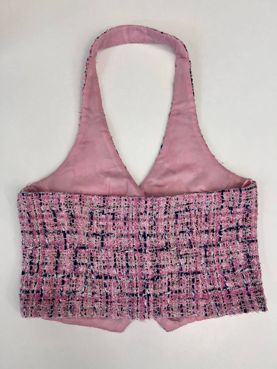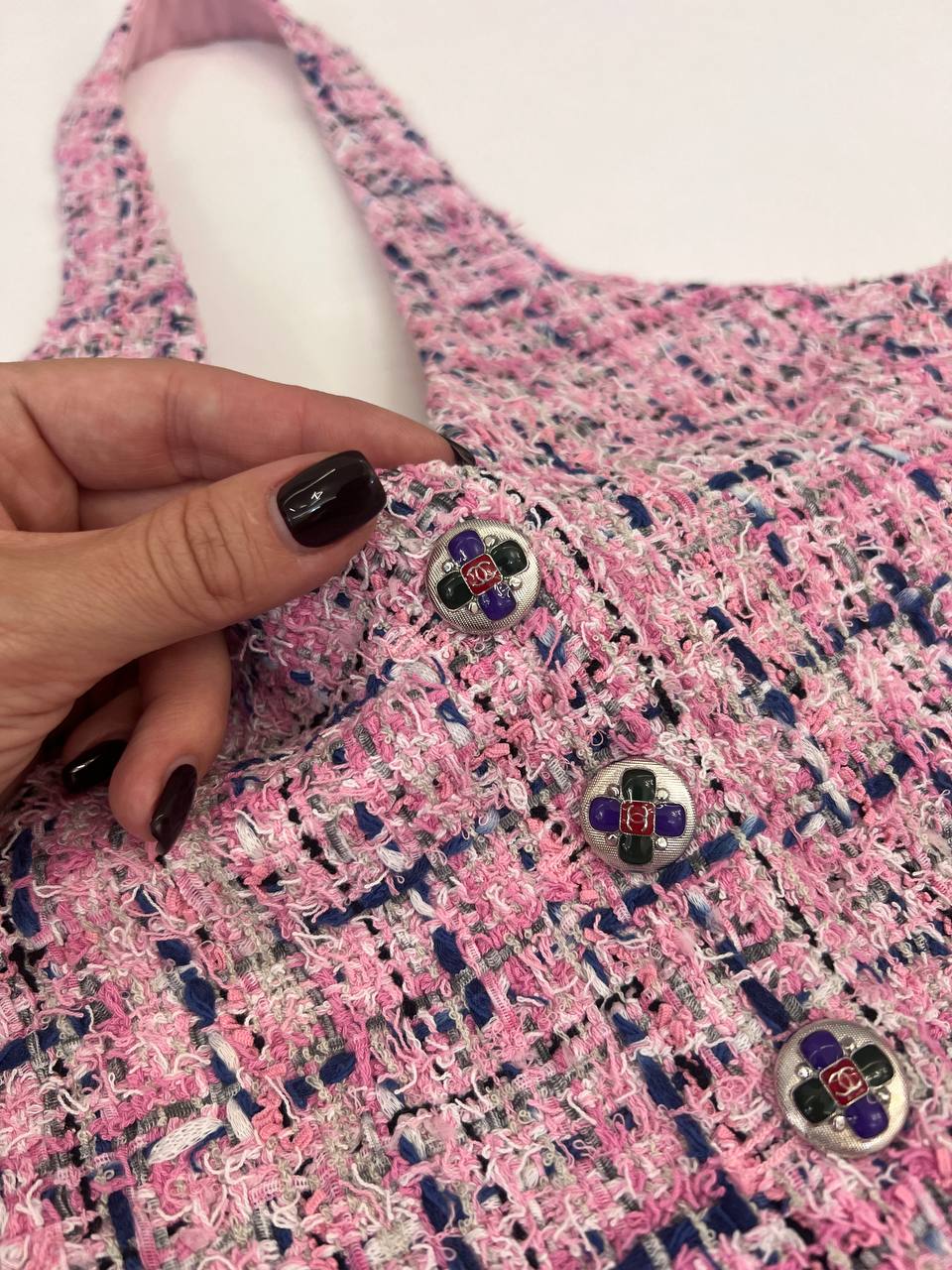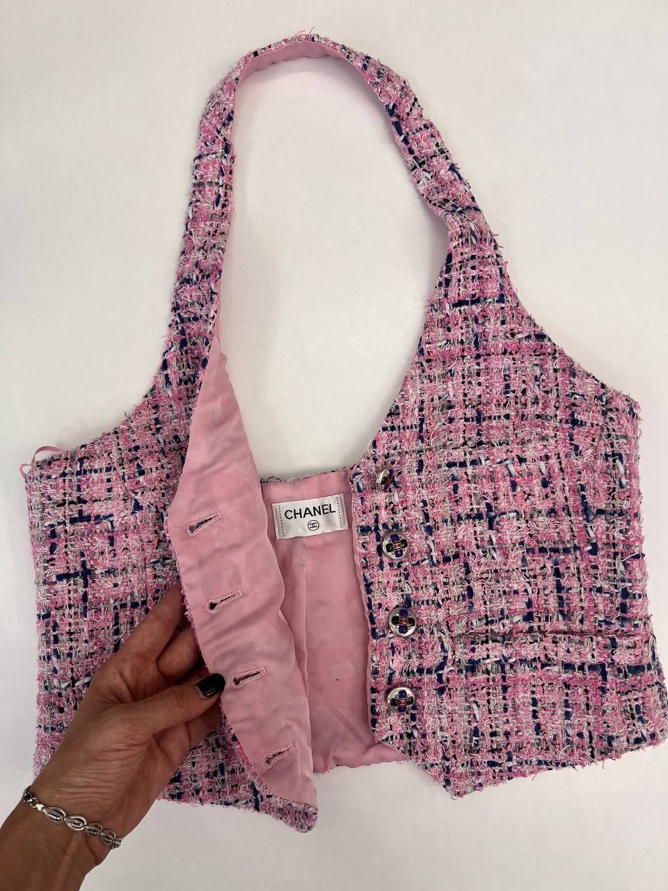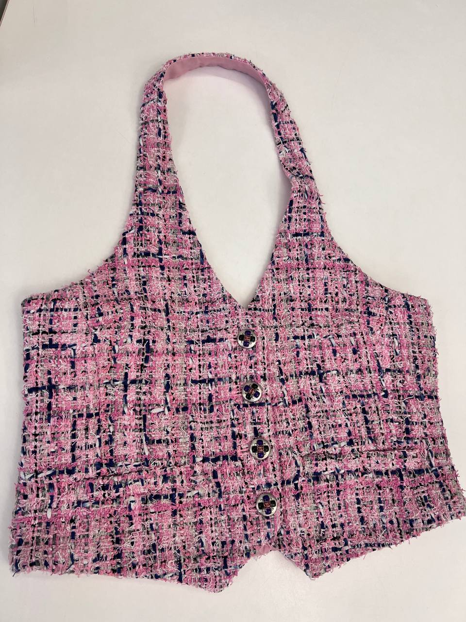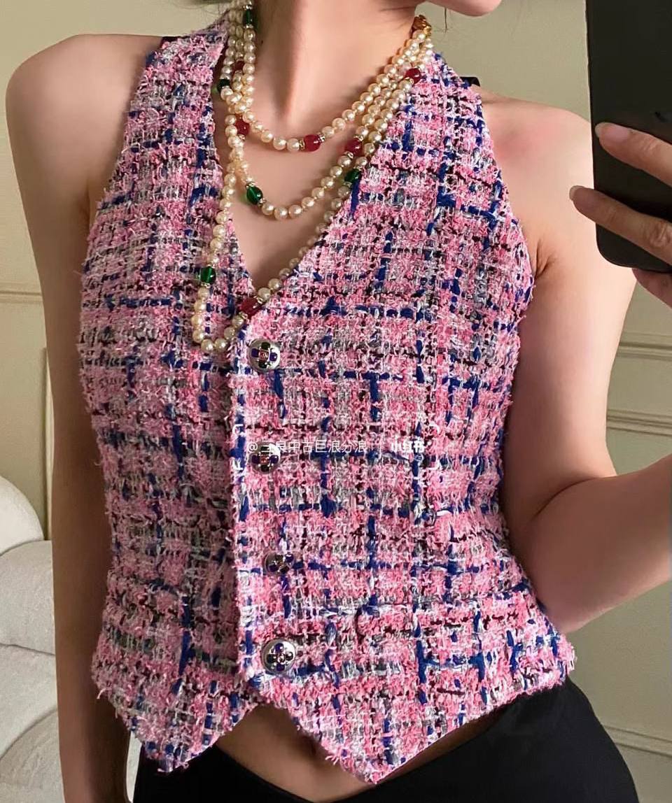 Жилет Chanel LUX-108279 — это элегантный предмет гардероба, выполненный в стиле французской моды. Жилет представлен в розовом цвете с переплетающимся синим узором, имеет текстурированную поверхность и украшен пуговицами. Он станет прекрасным дополнением к любому образу.