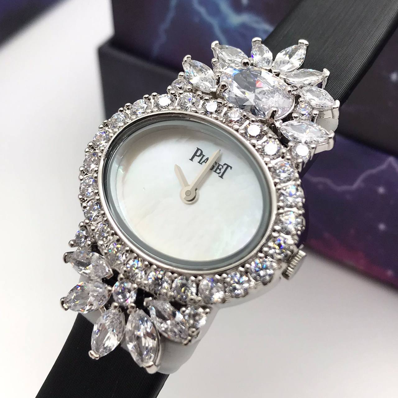 Часы Piaget LUX-91070 - это изысканное украшение для запястья, выполненное в классическом стиле. Серебристый корпус часов, инкрустированный кристаллами, придает им роскошный вид. Черный ремешок гармонично сочетается с дизайном циферблата.
