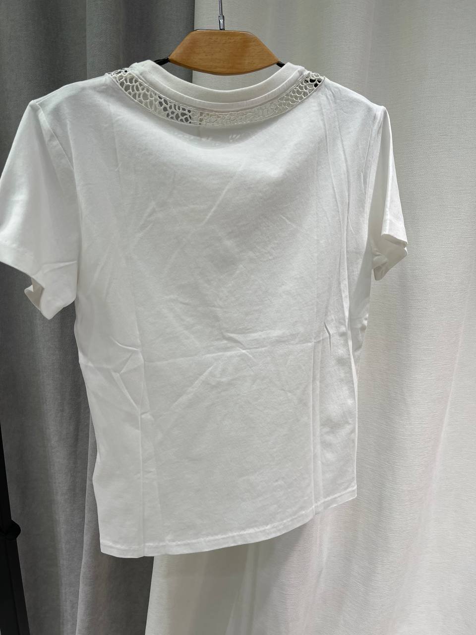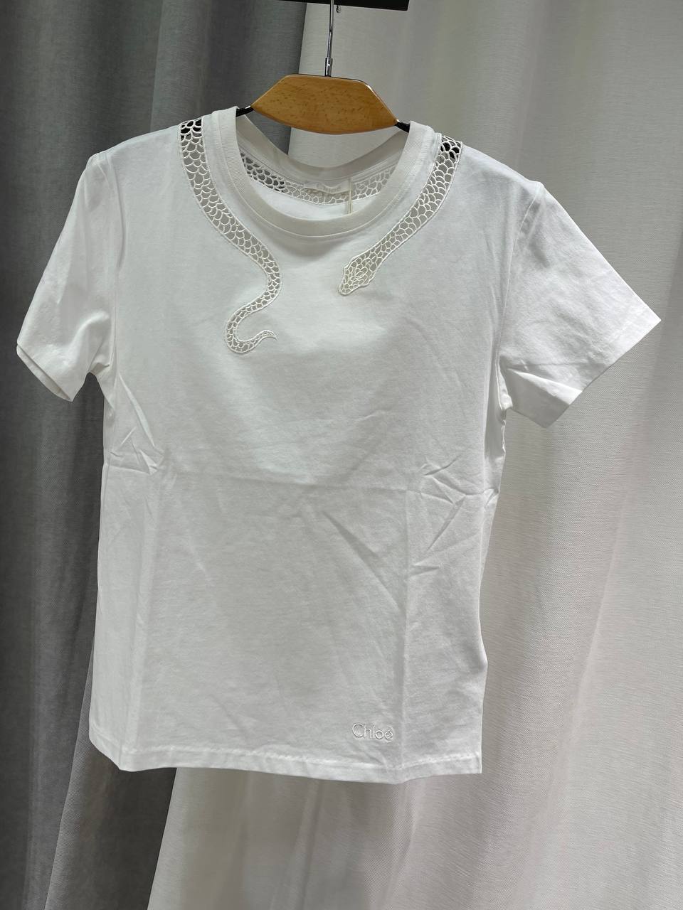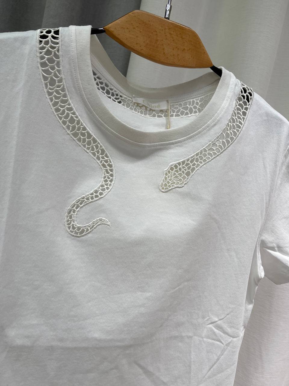 Футболка Chloe LUX-118729 — это стильный предмет гардероба от известного бренда, выполненный в минималистичном стиле с акцентом на декоре. Белая футболка с короткими рукавами декорирована кружевной вставкой в области ворота, имитирующей змею. Она идеально подходит для создания повседневных и элегантных образов.