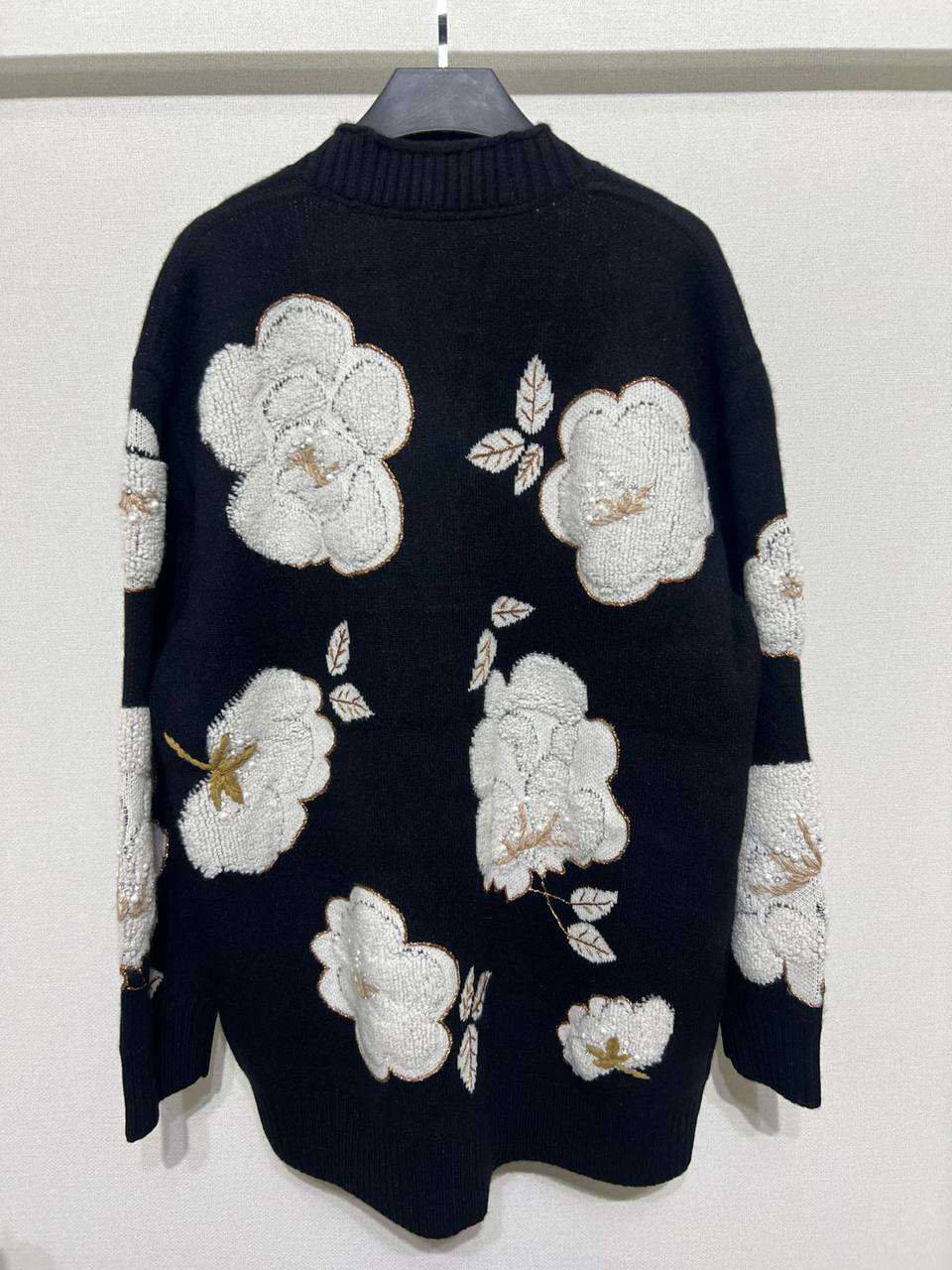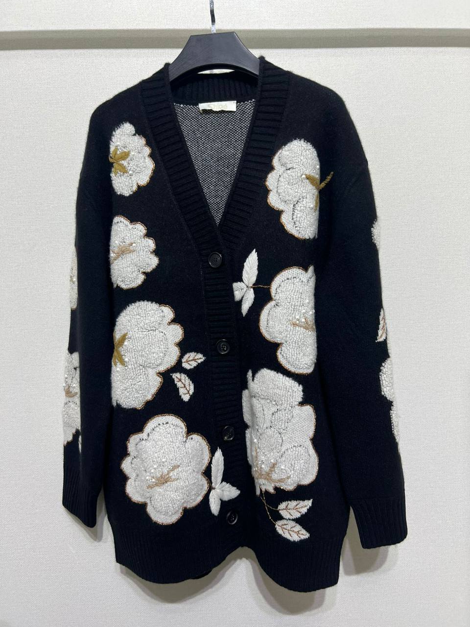 Кардиган Chloe LUX-112895 представляет собой стильный предмет гардероба с цветочной аппликацией. Чёрный фон кардигана контрастирует с белыми цветами, создавая элегантный и женственный образ. Идеально подходит для создания повседневных или вечерних нарядов.