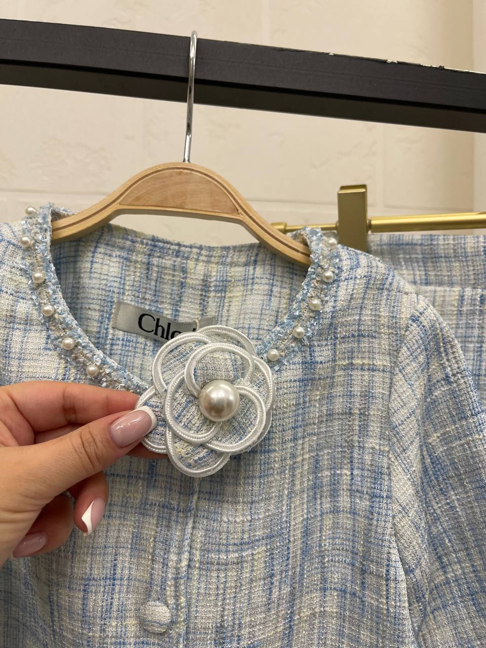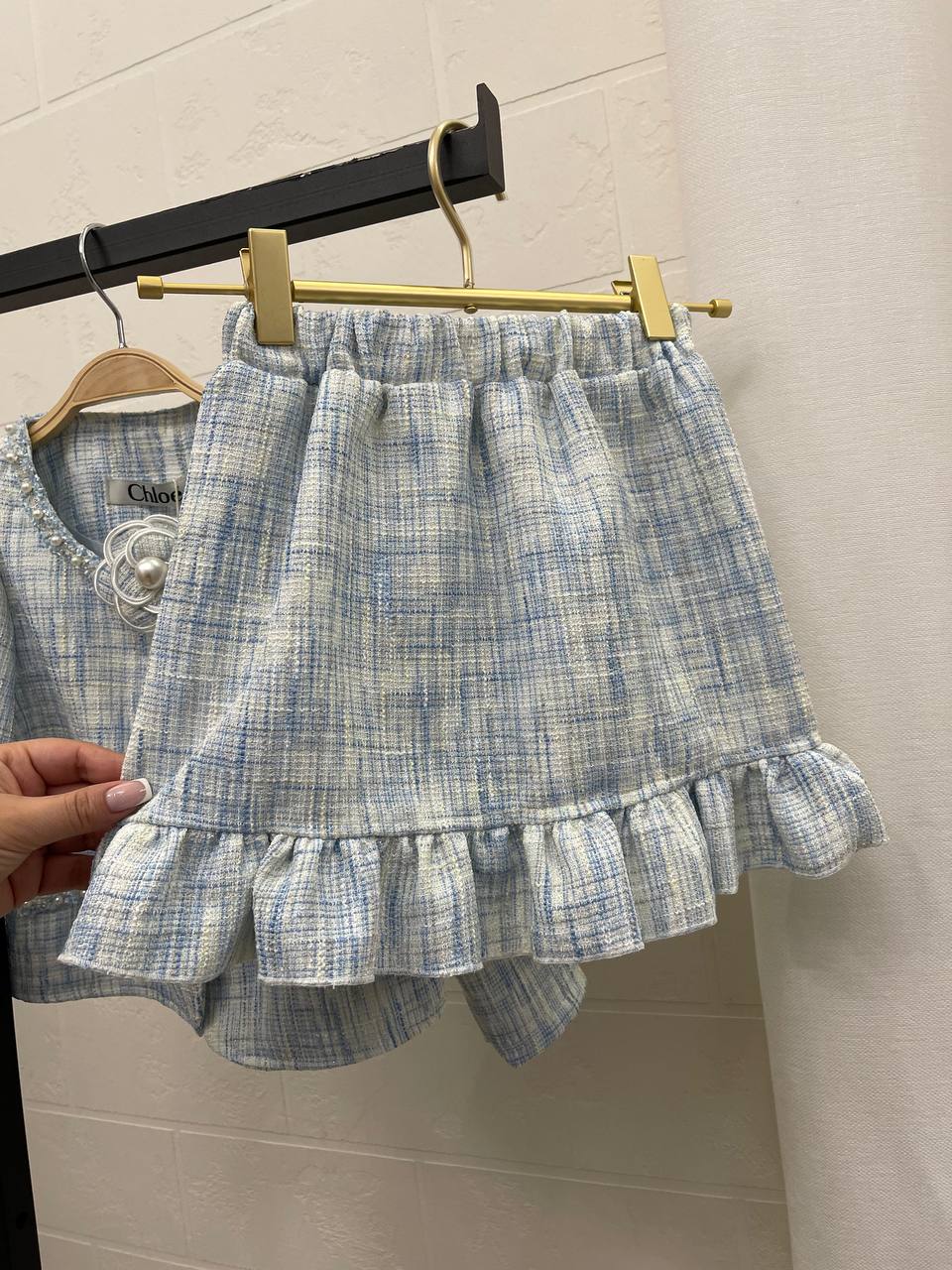Костюм Chloe LUX-101828 - это элегантный костюм, выполненный в классическом стиле. Он состоит из укороченного жакета с длинными рукавами и юбки. Костюм выполнен в нежно-голубом цвете с текстурой в виде плетения. Идеально подходит для создания утонченного образа.