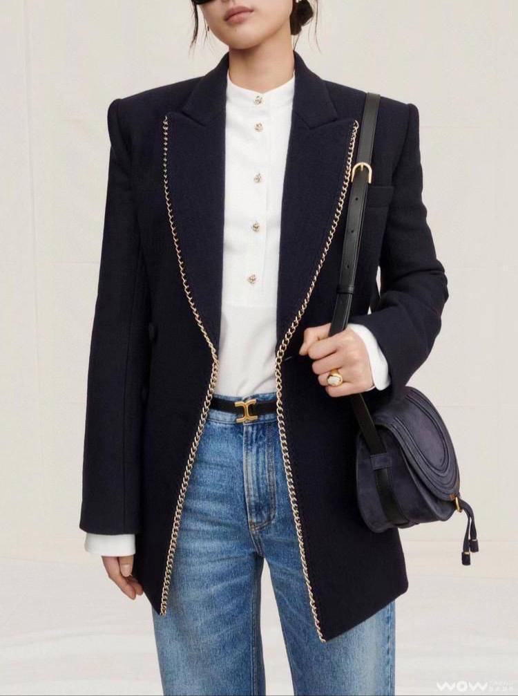 Жакет Chloe LUX-101835 – это элегантный предмет гардероба от известного бренда. Жакет выполнен в классическом стиле с акцентом на современность. Темно-синий цвет, украшенный золотой цепочкой по краям, придает изделию изысканный вид.