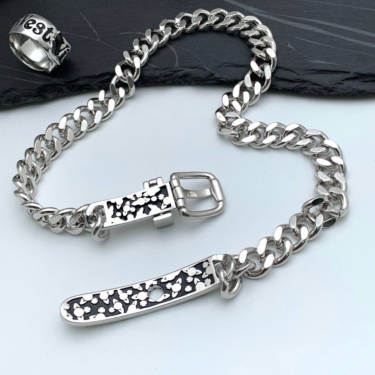 Чокер Vivienne Westwood LUX-115780 — это стильный аксессуар, выполненный в узнаваемом дизайне бренда. Чокер имеет серебристый цвет с гладкой текстурой и состоит из массивной цепочки с декоративной пластиной с названием бренда и оригинальной застежкой. Идеально подходит для создания эффектных образов, подчеркивая индивидуальность и добавляя нотку элегантности.