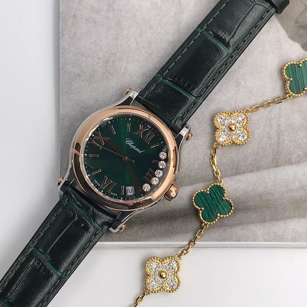 Элегантные женские часы Chopard LUX-46978 в корпусе из розового золота и стали с темно-зеленым циферблатом. Модель выполнена в классическом стиле, дополненная ремешком из крокодиловой кожи. Инкрустация из бриллиантов на циферблате придает часам особую изысканность.