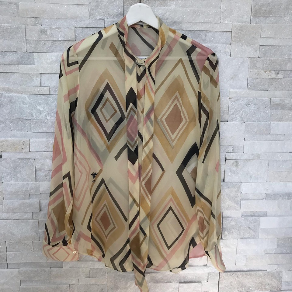 Блузка Christian Dior LUX-15946 представляет собой изысканное изделие в стиле casual chic. Прозрачная ткань с эффектным геометрическим принтом ромбов в бежевых, коричневых, черных и розовых тонах создает элегантный и узнаваемый образ. Эта блузка идеально подходит для создания стильных и женственных образов, как для повседневной носки, так и для особых случаев.