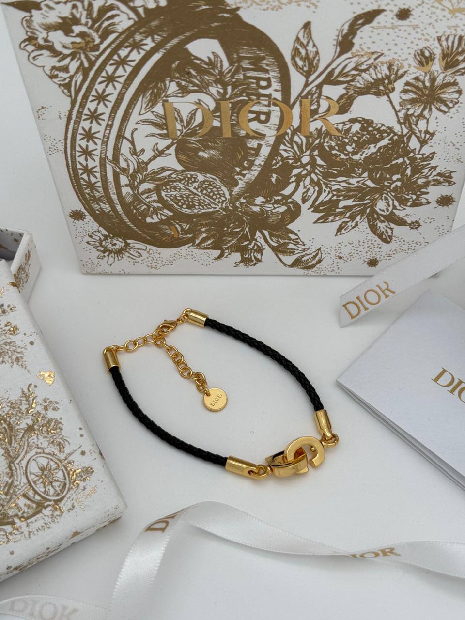 Браслет Christian Dior LUX-114870 — это изысканный аксессуар, сочетающий в себе элегантность и стиль. Браслет выполнен в классическом стиле, его чёрный шнурок дополняется золотистыми элементами, создавая роскошный вид. Он идеально подойдёт для повседневного ношения и станет прекрасным дополнением к любому образу.