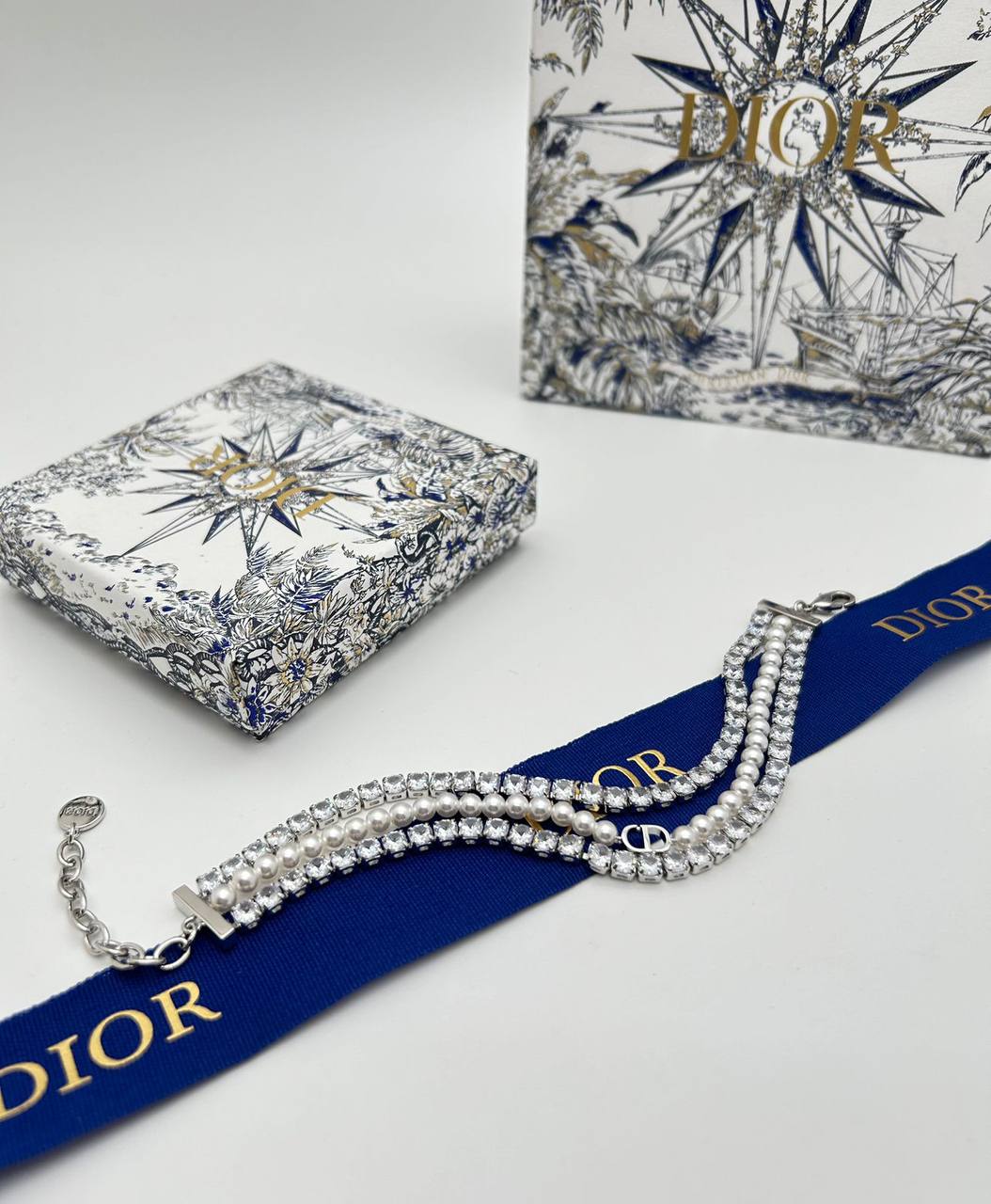 Браслет Christian Dior LUX-112392 — изысканный аксессуар, сочетающий в себе элегантность и утонченность. Браслет выполнен в классическом стиле, украшен жемчугом и кристаллами, что придает ему изысканный вид. Идеально подходит для дополнения вечерних образов, а также для повседневного использования, чтобы добавить нотку роскоши.