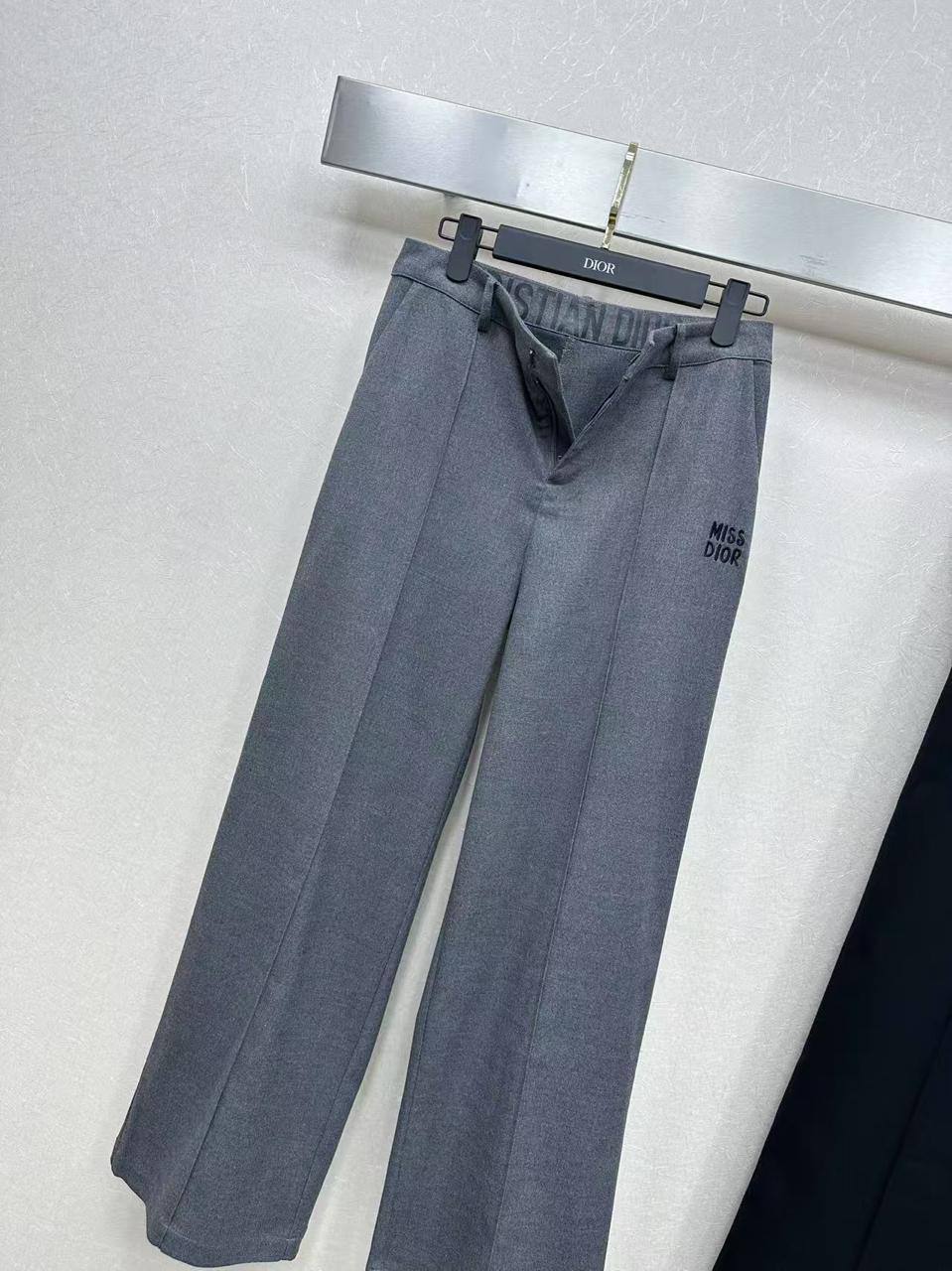 Брюки Christian Dior, модель LUX-116782, это стильные брюки, выполненные в современном стиле. Представлены в сером цвете, с логотипом "MISS DIOR" на одной из штанин. Брюки имеют прямой крой, что делает их подходящими для различных образов.