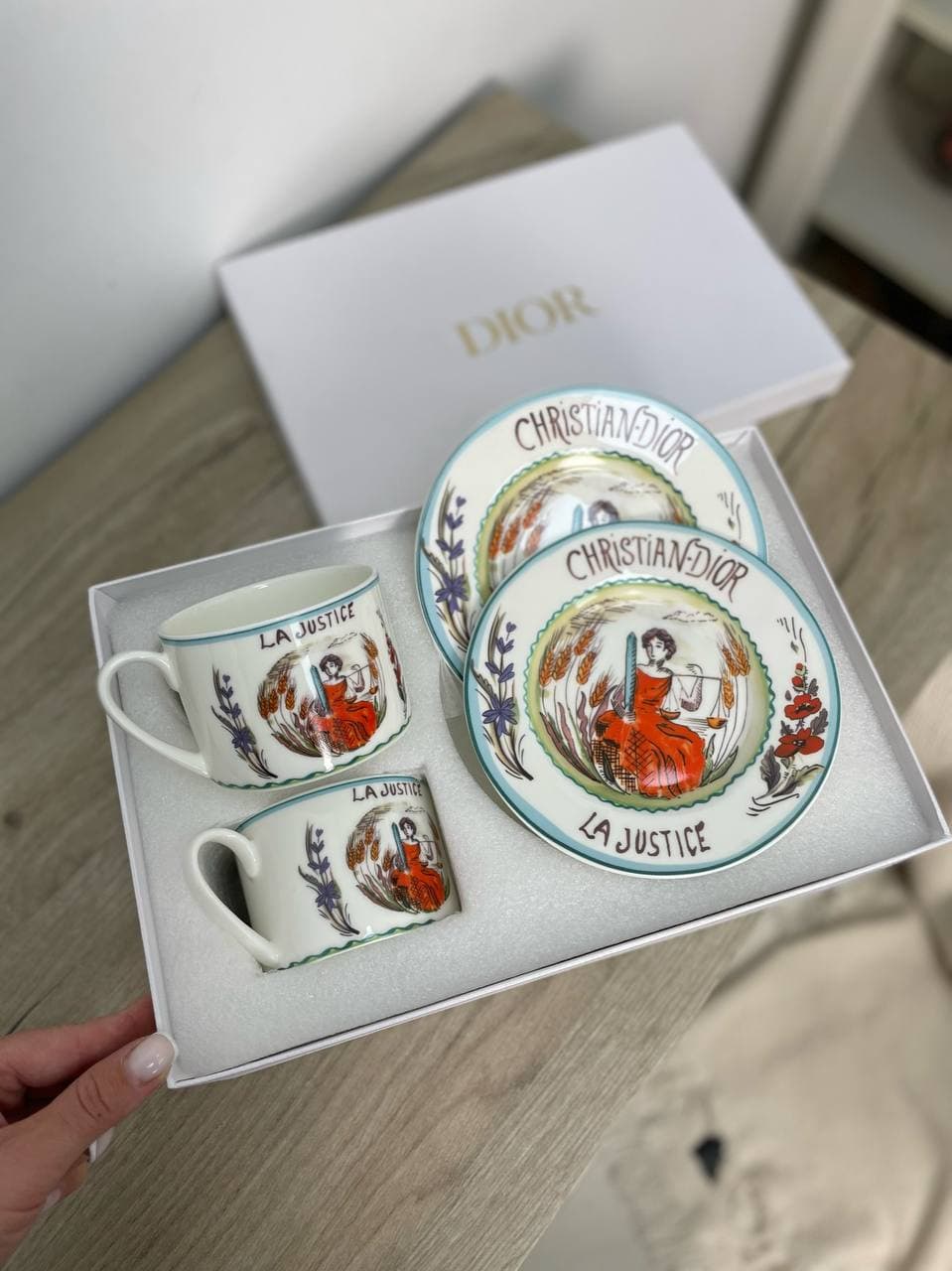 Чайная пара Christian Dior LUX-58535 представляет собой изысканный набор, выполненный в классическом стиле. На чашках и блюдцах изображена аллегория Правосудия, окруженная колосьями пшеницы, что придает набору особую символичность. Использование качественных материалов гарантирует долговечность и элегантный внешний вид. Этот набор идеально подойдет для создания торжественной атмосферы во время чаепития или как утонченный элемент декора.