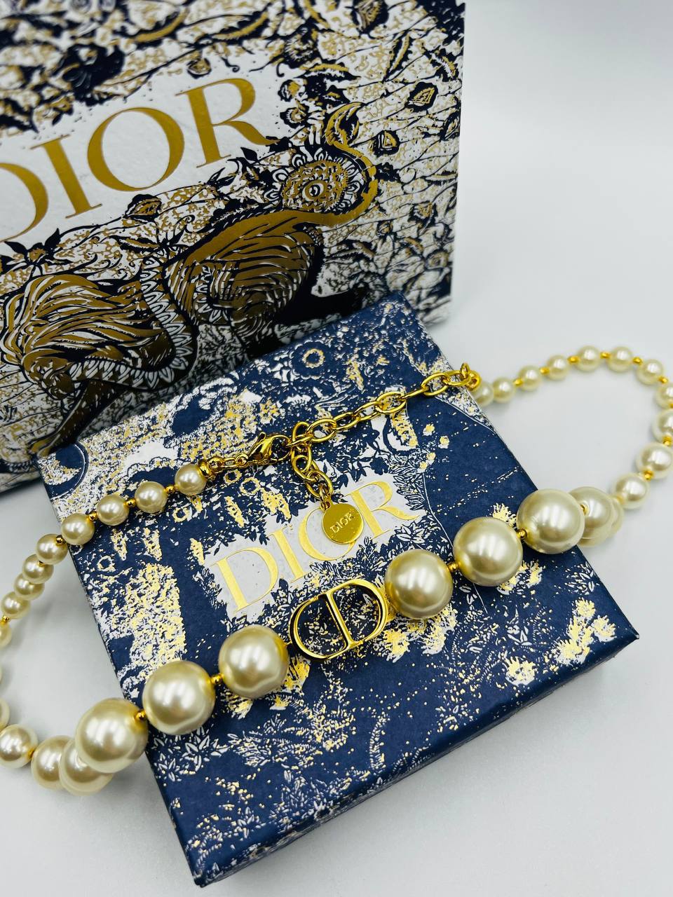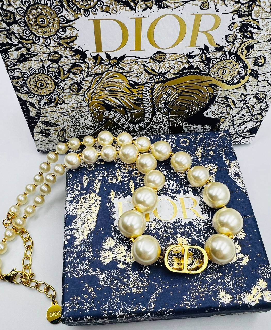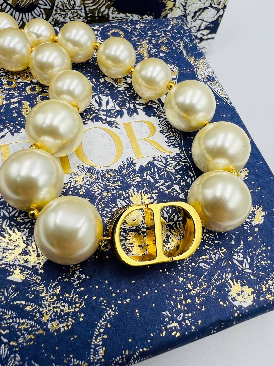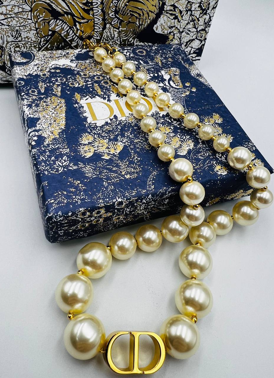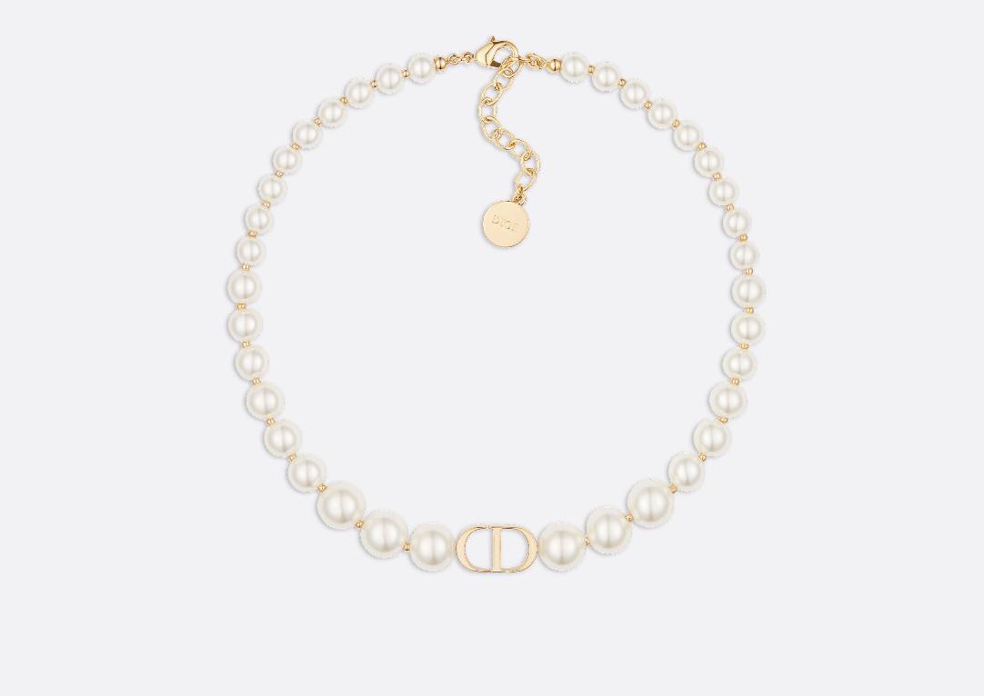 Чокер-колье Christian Dior LUX-103594 – элегантное украшение в классическом стиле. Чокер выполнен в белом цвете с имитацией жемчужин. Центральным элементом является золотистая подвеска с логотипом бренда.