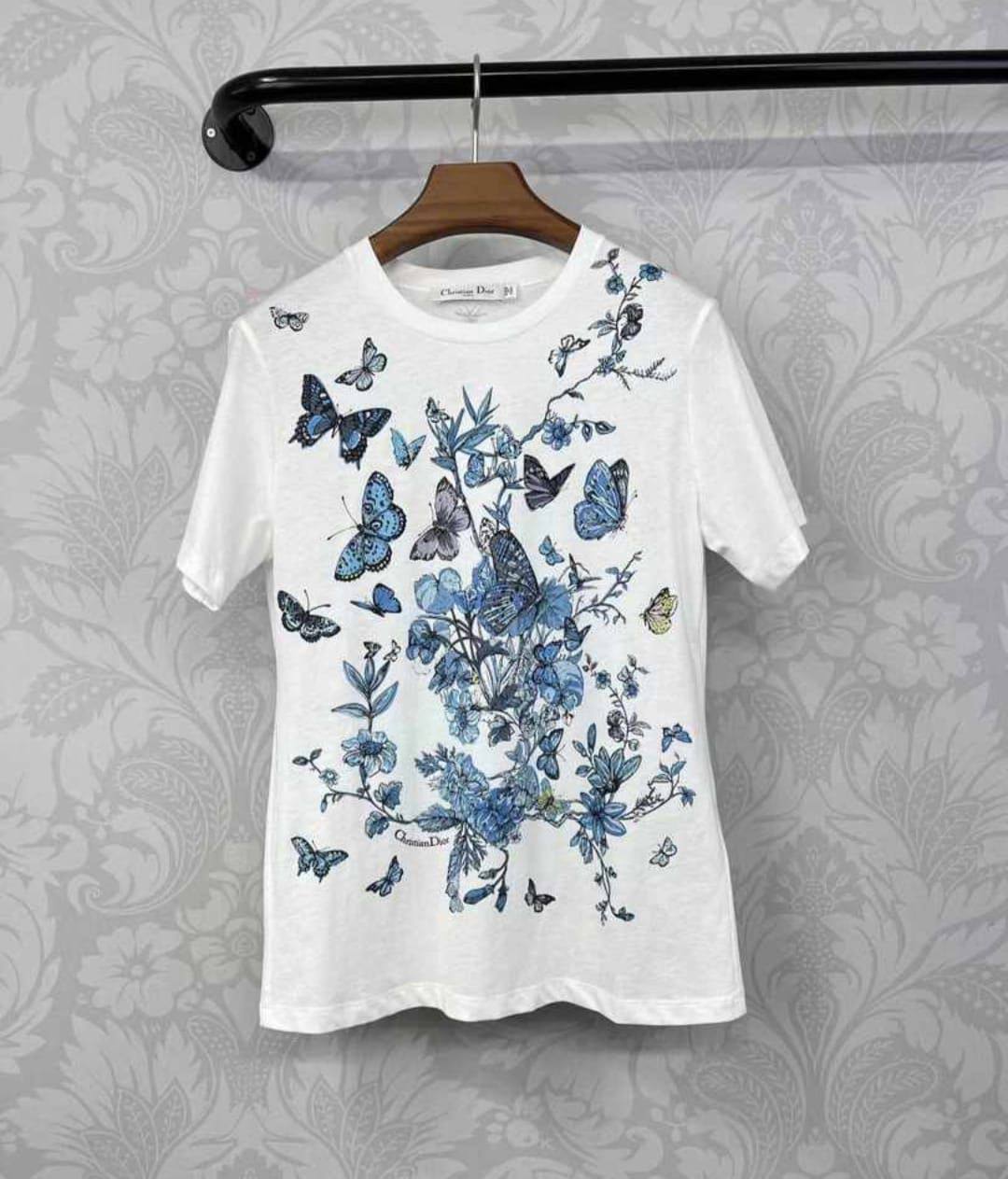Футболка Christian Dior LUX-98203 — это воплощение изысканности и стиля. Футболка выполнена в белом цвете и украшена ярким принтом в виде бабочек и цветов, что придает ей свежий и романтичный вид. Она отлично подойдет для создания повседневных, но элегантных образов.