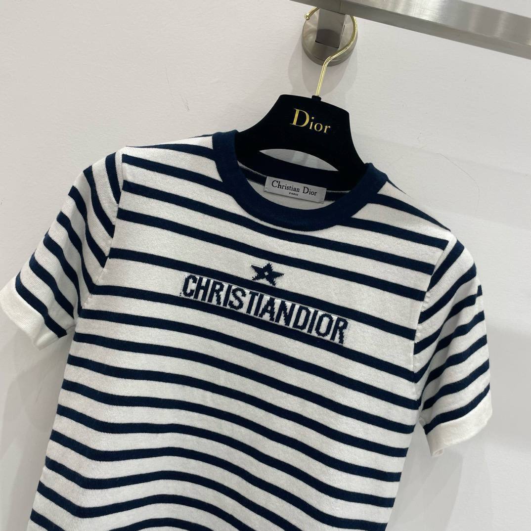 Футболка Christian Dior LUX-103788 — это стильная вещь от известного бренда, сочетающая в себе классику и современность. Футболка выполнена в полосатом дизайне с контрастными темно-синими и белыми полосами. Модель имеет круглый вырез и короткий рукав, что делает ее универсальной для различных образов.