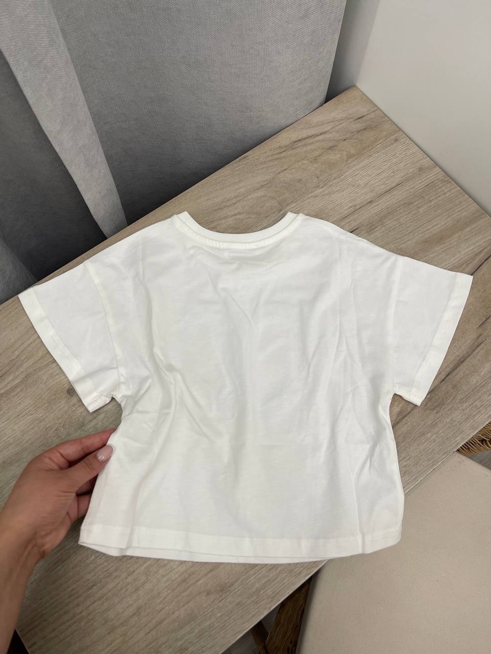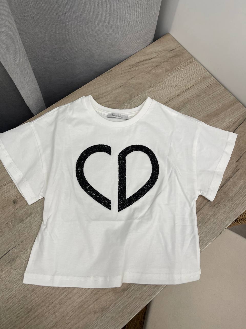 Футболка Christian Dior LUX-101970 – это стильная детская футболка от известного бренда. Она выполнена в минималистичном стиле, белого цвета, с крупным декоративным элементом в виде логотипа бренда в форме сердца, украшенного блестящим материалом. Футболка подходит для повседневной носки, легко сочетается с различной одеждой.