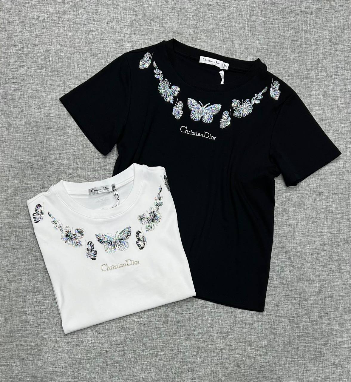 Футболка Christian Dior LUX-106143 – это стильный предмет гардероба от известного бренда. Футболка выполнена в черном цвете, украшена узором из сверкающих бабочек, что придает ей элегантный и нарядный вид. Идеально подходит для создания модных и запоминающихся образов.