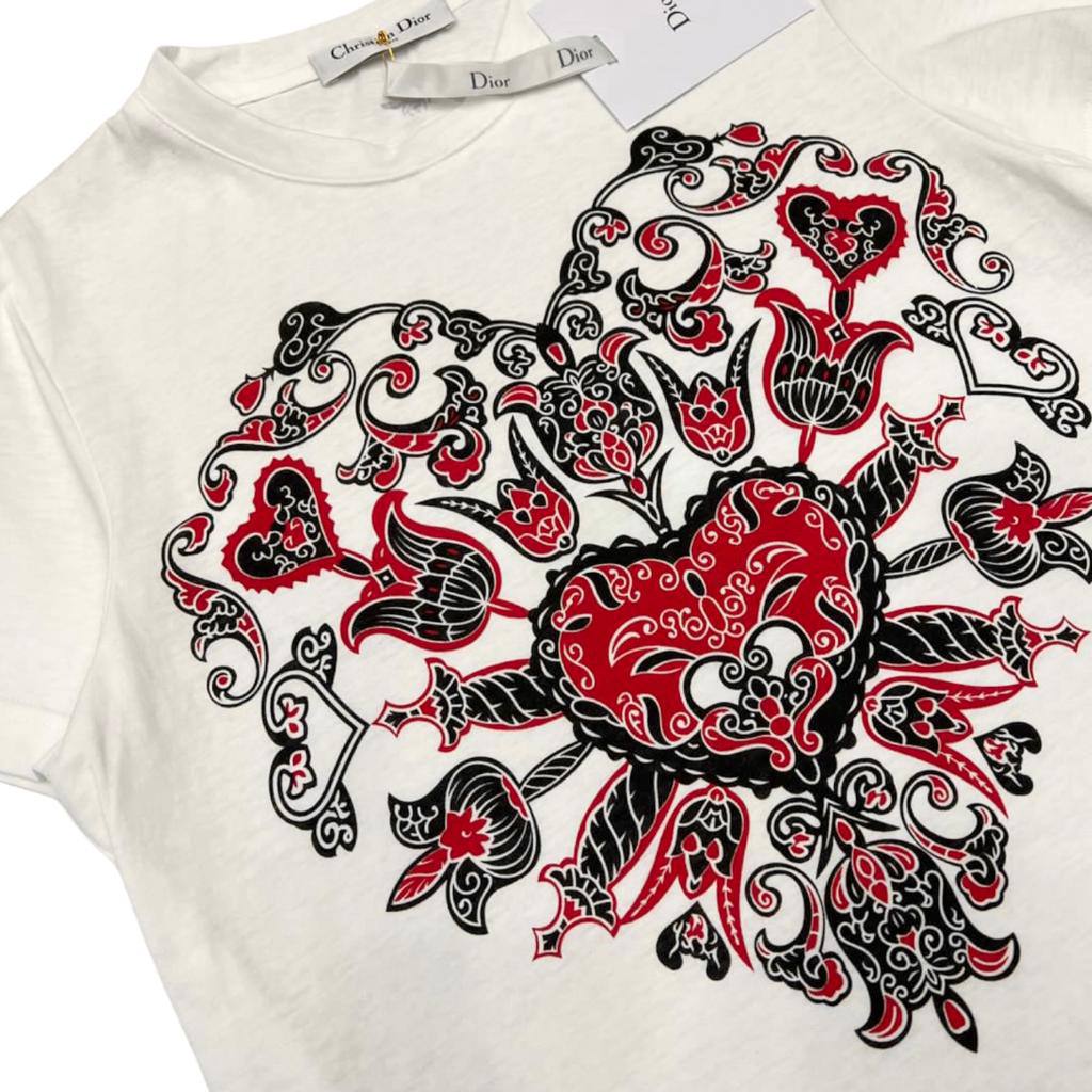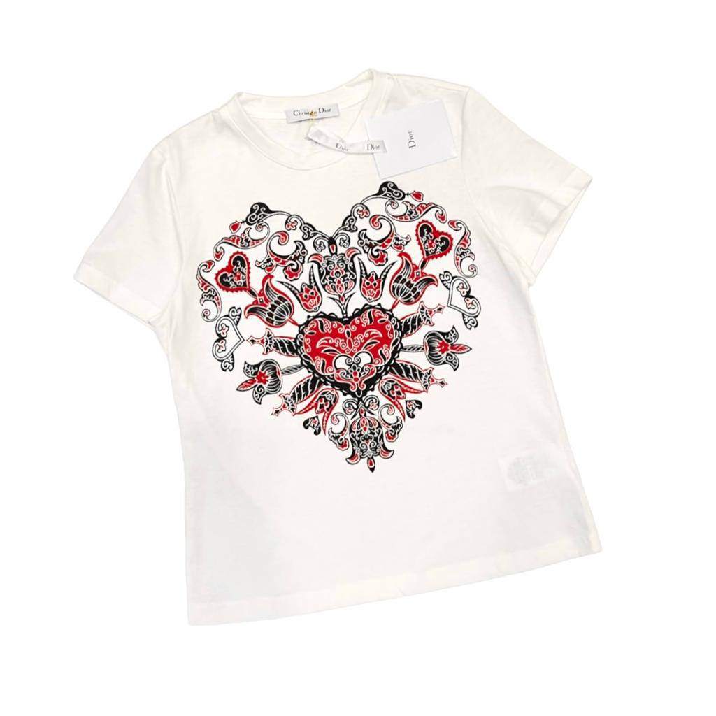 Футболка Christian Dior LUX-83651 представляет собой элегантную модель для повседневного гардероба. Белый цвет футболки в сочетании с ярким принтом в форме сердца создает стильный акцент. Этот предмет одежды идеально подойдет для создания как повседневных, так и более нарядных образов.