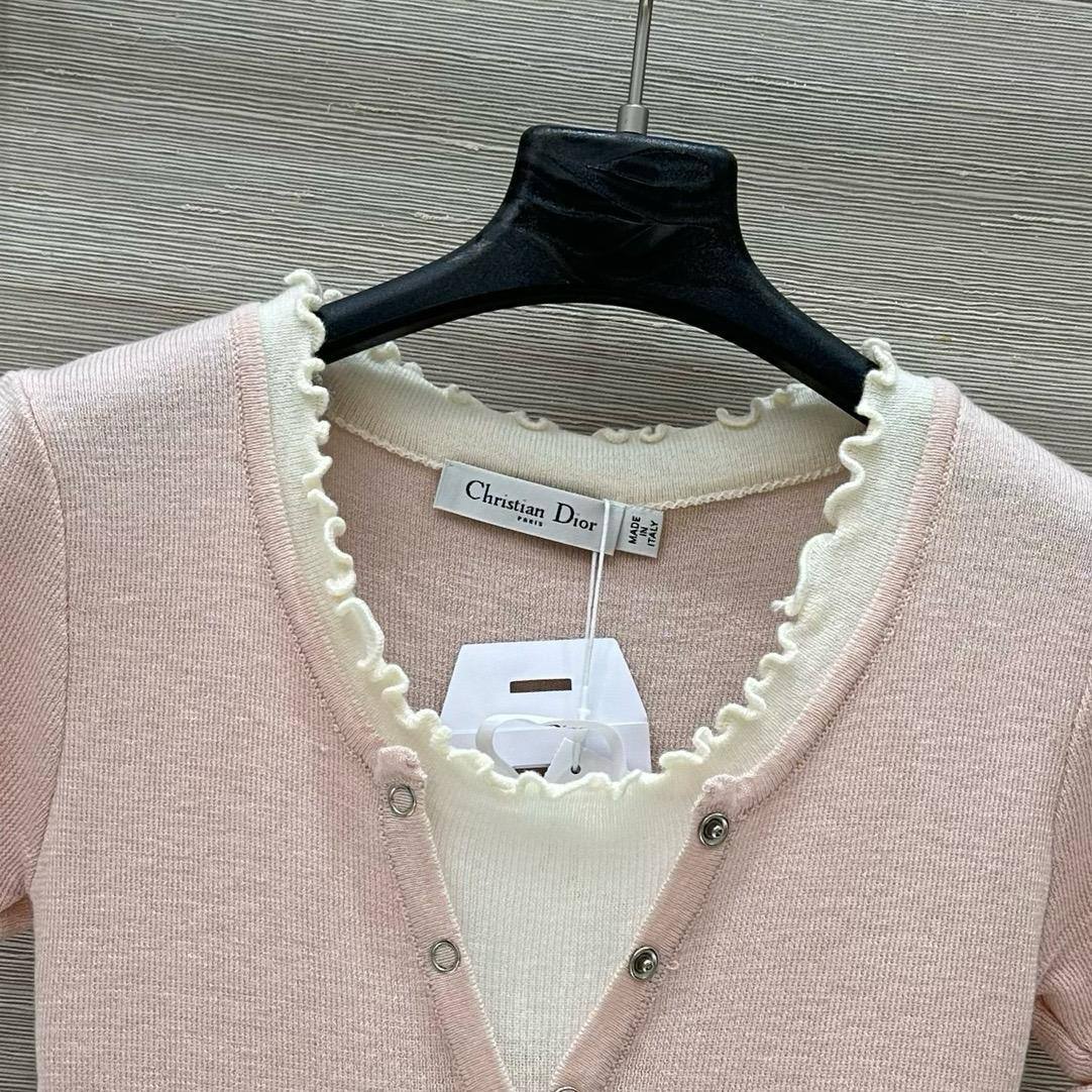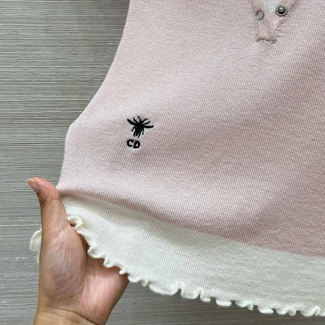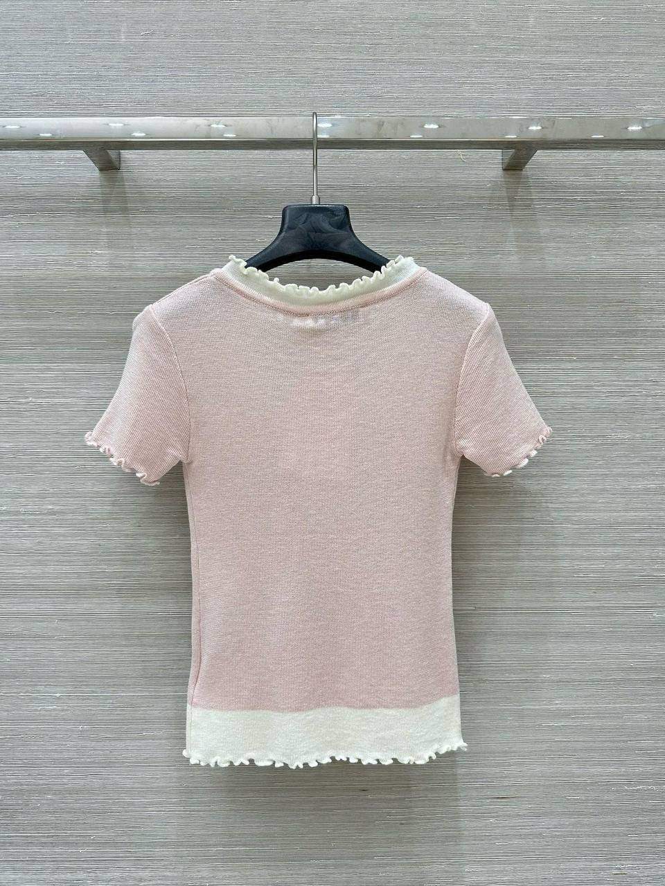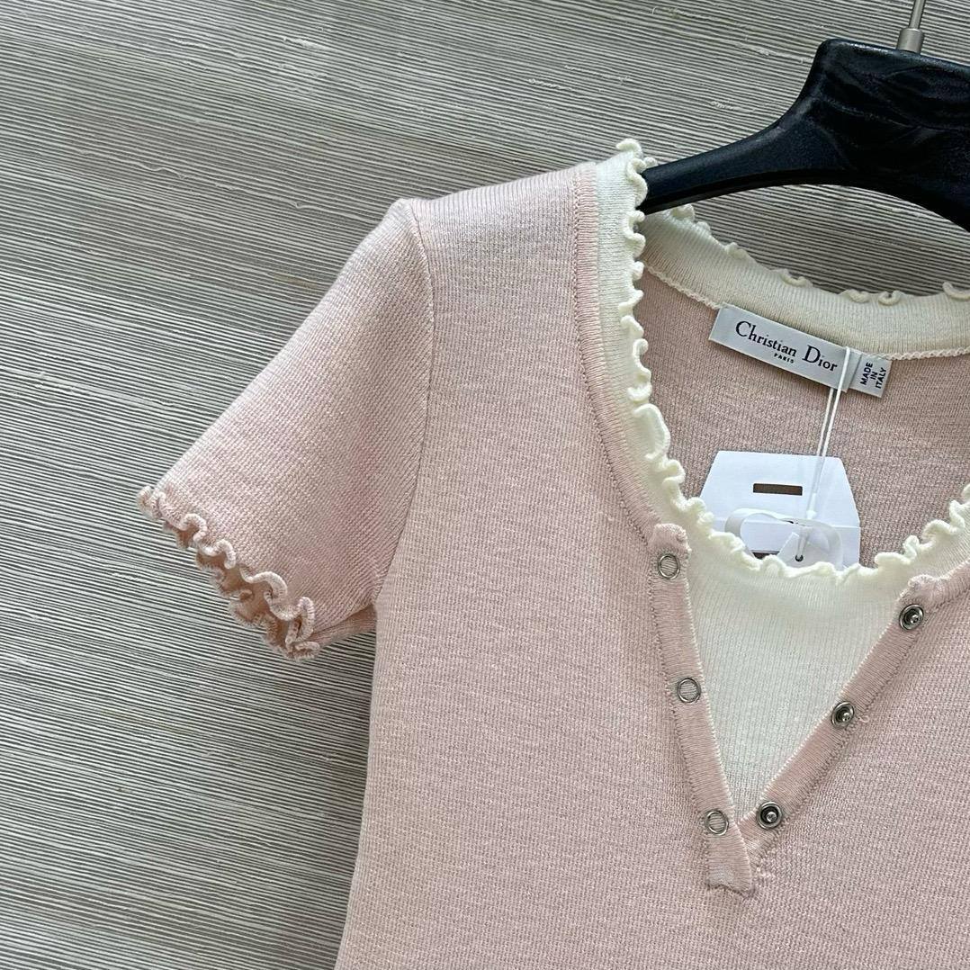 Футболка Christian Dior (артикул LUX-115904) представляет собой женственную модель в нежном стиле. Розовая футболка с короткими рукавами имеет отделку в виде волнистого края, который придает ей особый шарм. Акцент сделан на логотипе бренда, расположенном на груди.
