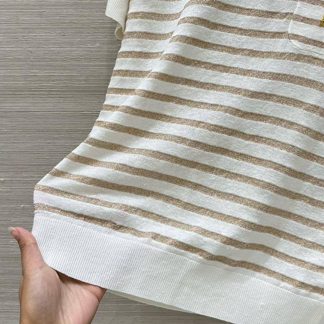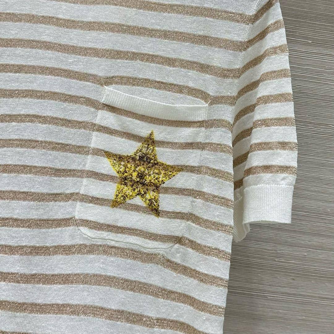 Футболка Christian Dior LUX-116568 — это стильная футболка в полоску, выполненная в нейтральных тонах. Дизайн включает в себя золотистые полосы на белом фоне, а также маленький карман с аппликацией в виде звезды. Она сочетает в себе повседневный стиль с элементами роскоши, что делает ее подходящей для различных образов.