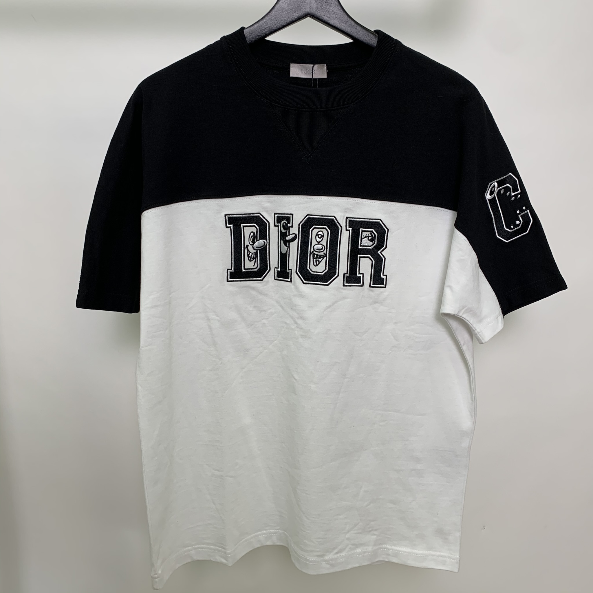 Christian Dior футболка LUX-44149 представляет собой стильный и узнаваемый элемент гардероба, сочетающий в себе спортивный силуэт и игривый дизайн. Верхняя часть футболки выполнена в черном цвете, переходящая в контрастную белую нижнюю часть. На груди расположен крупный, объемный принт с названием бренда "DIOR", буквы которого выполнены в стиле университетской формы с забавными мультяшными лицами. На рукаве также присутствует декоративный элемент в виде буквы "C". Эта футболка идеально подойдет для создания модных повседневных образов.