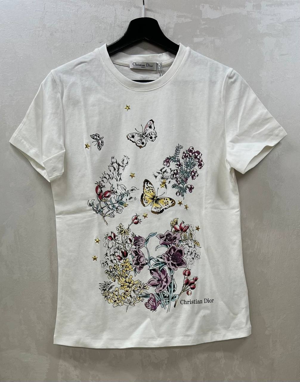 На изображении представлена стильная футболка Christian Dior с оригинальным принтом, сочетающим в себе цветочные мотивы и изображения бабочек. Эта футболка станет ярким акцентом в вашем гардеробе, подчеркивая индивидуальность и безупречный вкус.
