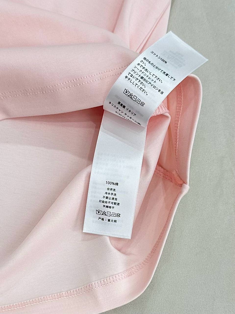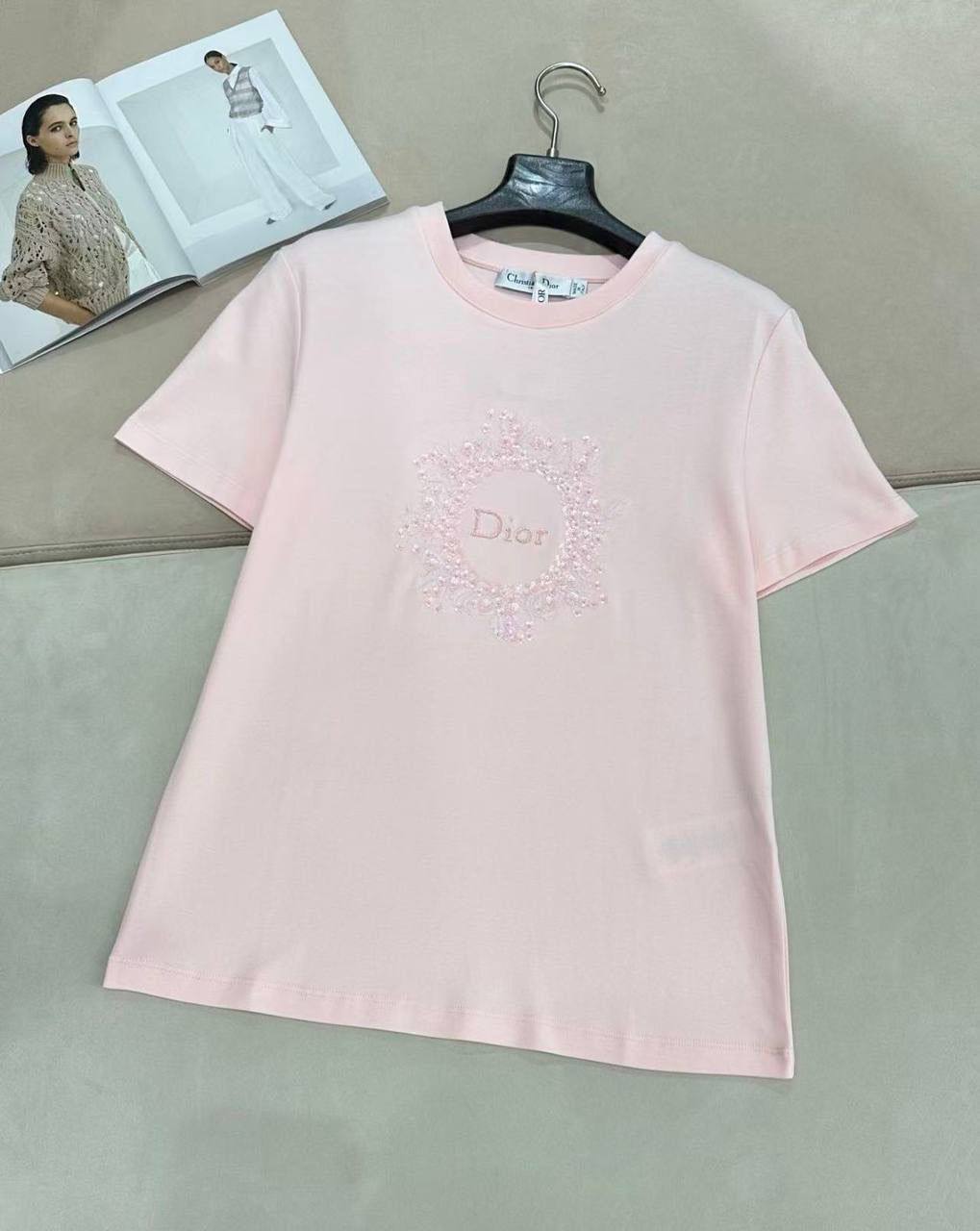 Нежная футболка Christian Dior с фирменным логотипом, украшенным блестящими деталями, станет прекрасным дополнением к вашему гардеробу. Она сочетает в себе элегантность и комфорт.