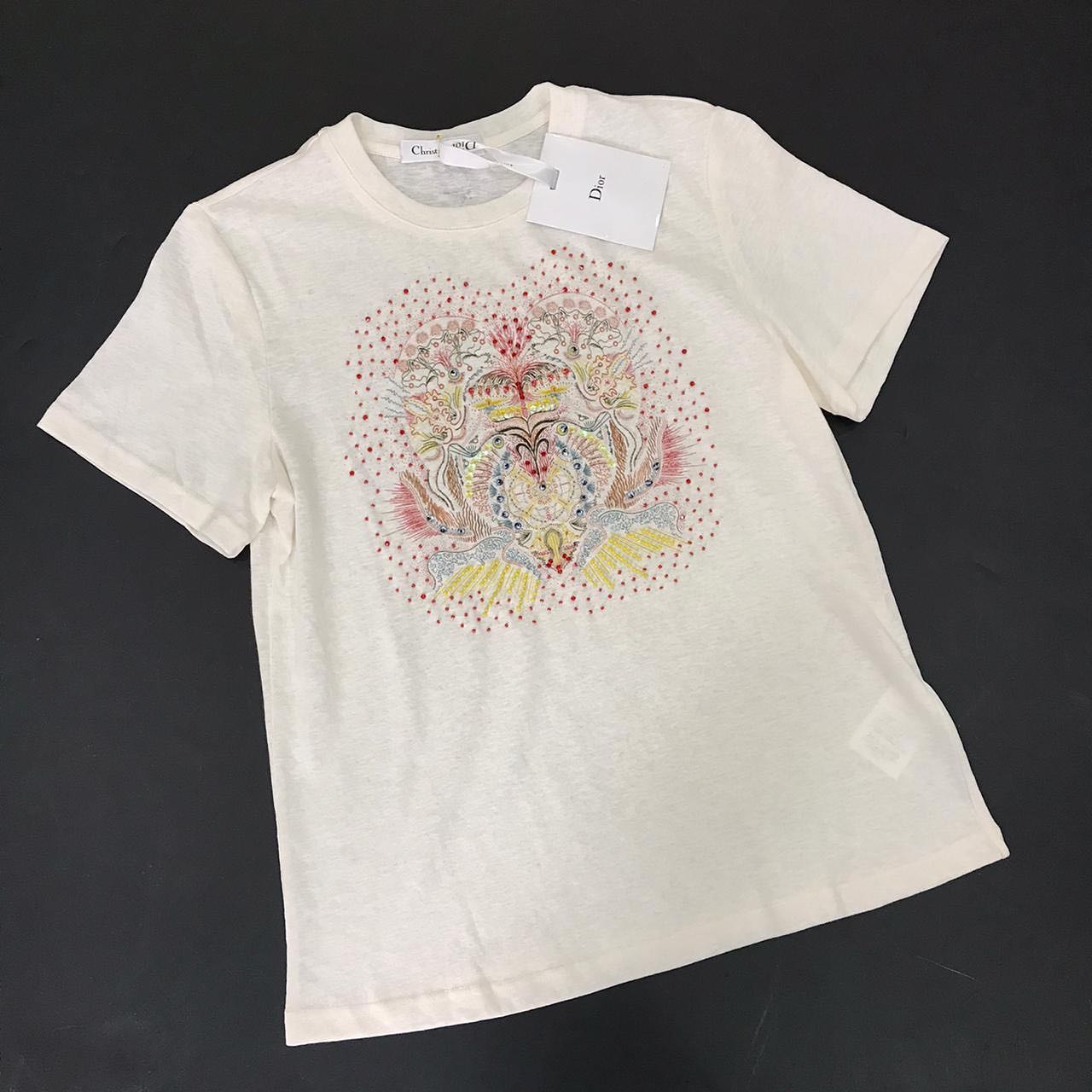 Футболка Christian Dior LUX-46261 – это изысканный предмет гардероба, отличающийся утонченным дизайном и вниманием к деталям. Белый цвет футболки служит идеальным фоном для яркой и замысловатой вышивки, напоминающей мандалу или герб, выполненной разноцветными нитями и блестящими элементами. Эта модель от Christian Dior идеально подойдет для создания стильных и запоминающихся образов.