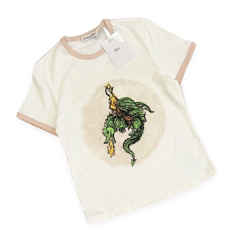 Christian Dior Футболка LUX-52442 — это стильная и комфортная футболка с уникальным принтом. Модель выполнена в классическом крое с короткими рукавами и круглым вырезом, дополненным контрастной бежевой отделкой. На передней части футболки расположен яркий графический рисунок, изображающий фигуру человека верхом на драконе, что придает изделию оригинальность и выразительность.