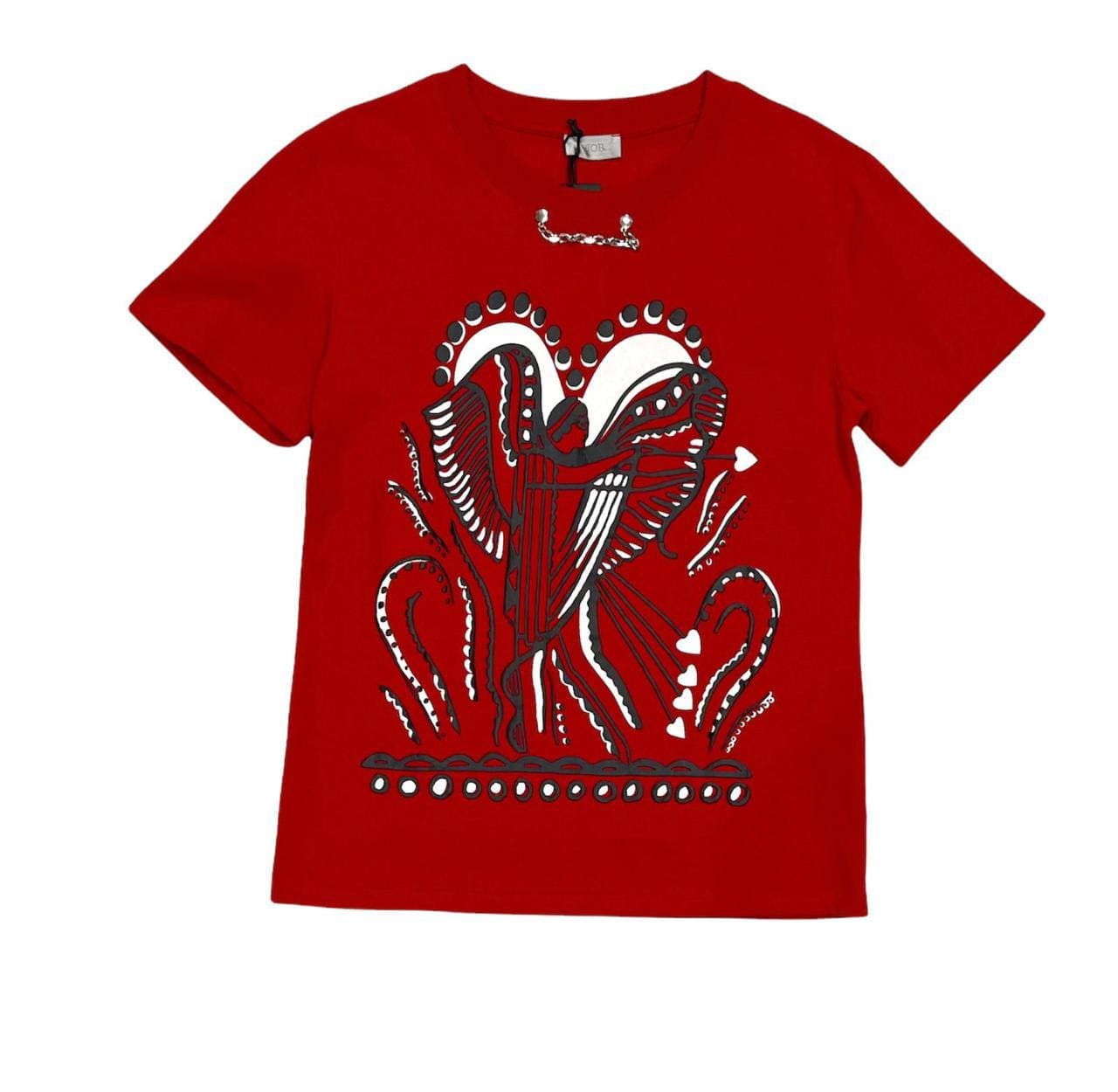 Представляем вам уникальную футболку Christian Dior LUX-62553, выполненную в ярко-красном цвете. Изделие украшено оригинальным принтом в виде стилизованного сердца с ангелом и декоративными элементами, выполненными в контрастных черных и белых тонах. Эта модель от Christian Dior сочетает в себе элегантность и современный стиль, идеально подходя для создания выразительных повседневных образов.