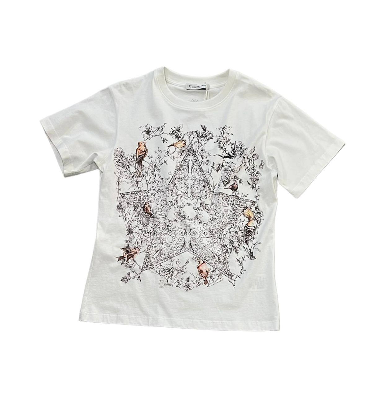 Футболка женская Christian Dior LUX-81578 — это стильный предмет гардероба от известного бренда. Футболка выполнена в классическом белом цвете и декорирована уникальным принтом в виде звезды с изображением птиц и растений. Этот предмет одежды идеально подходит для создания модных и элегантных образов на каждый день.