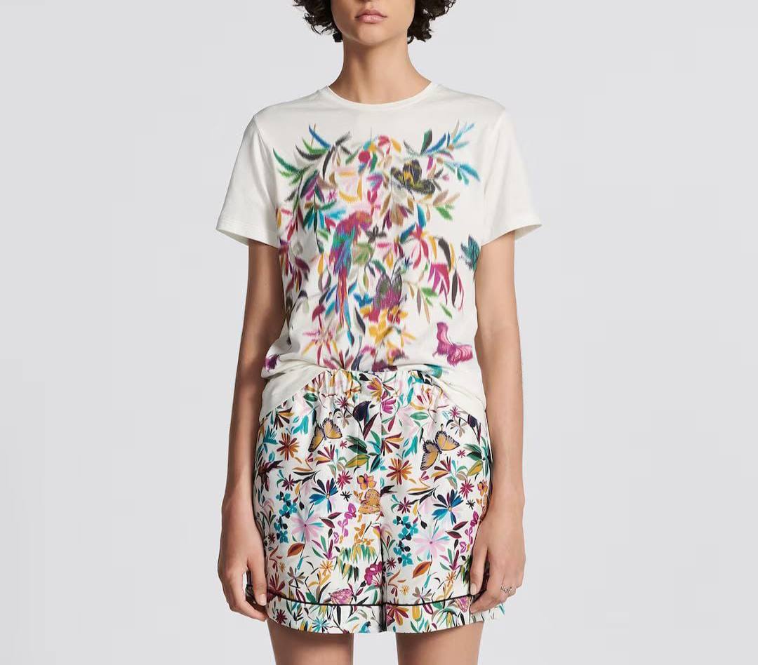 Футболка женская Christian Dior LUX-102180 представляет собой стильную и элегантную вещь. Футболка выполнена в белом цвете с ярким цветочным принтом. Идеально подходит для создания повседневных образов.