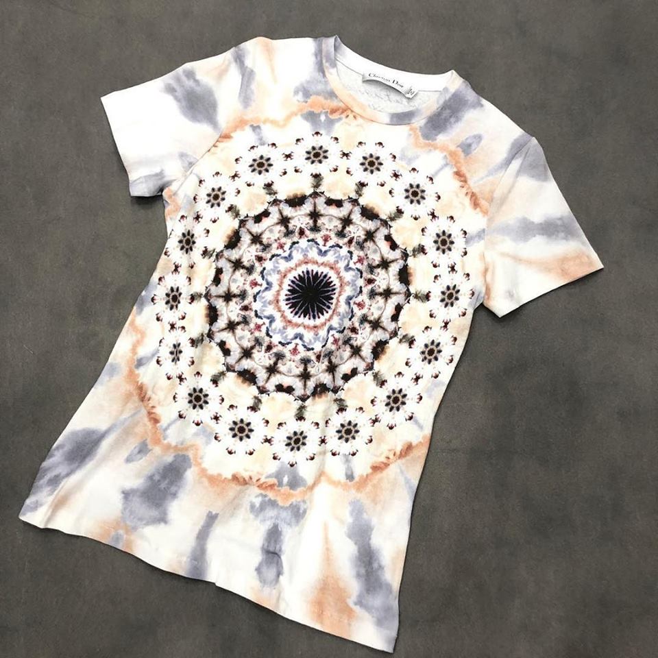 Стильная женская футболка Christian Dior LUX-11507 с ярким мандала-принтом в стиле тай-дай. Оригинальный дизайн подчеркнет вашу индивидуальность и добавит изюминку в повседневный образ. Футболка идеально подходит для создания расслабленных, но при этом трендовых луков.