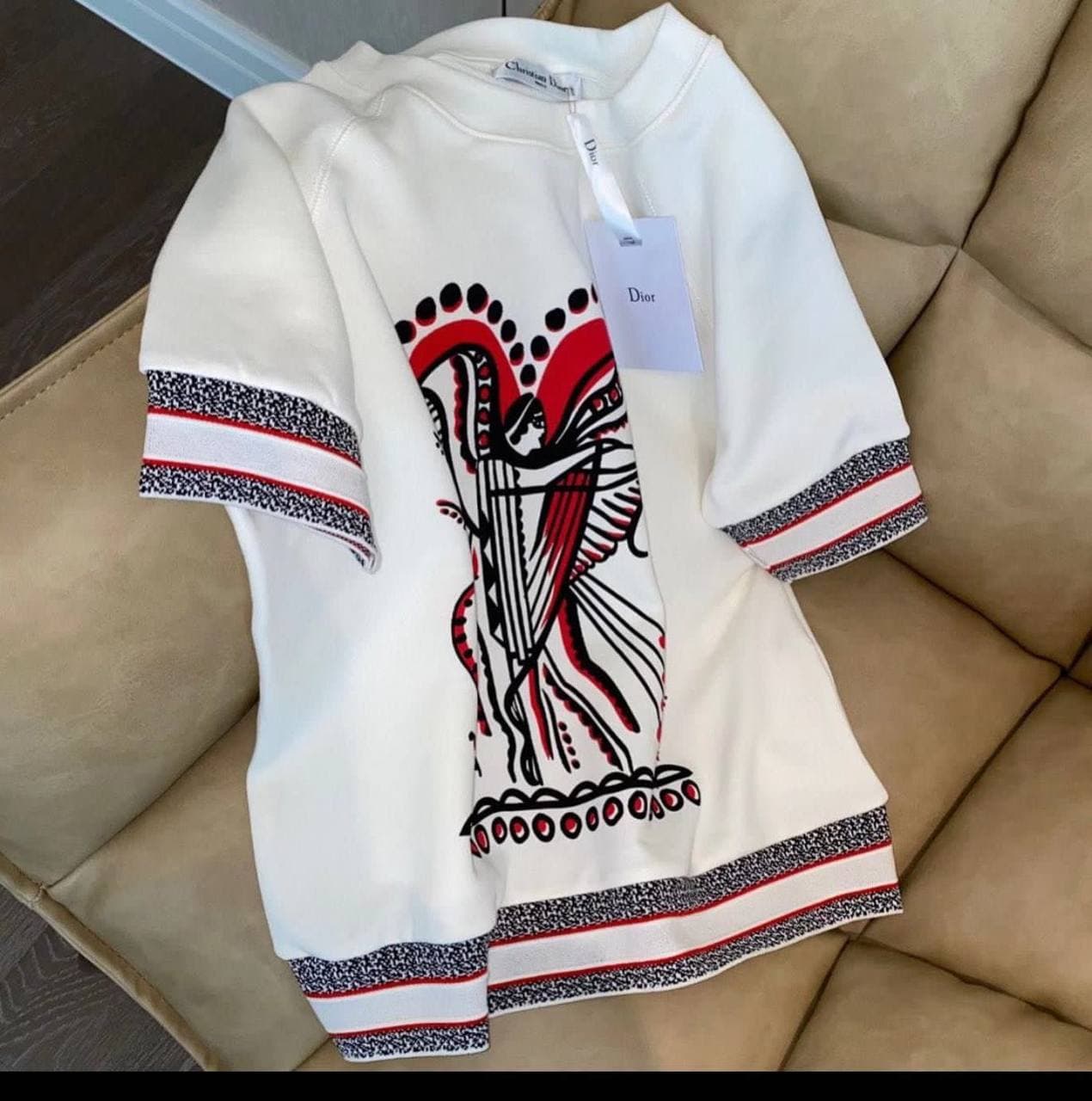 Эта футболка Christian Dior LUX-62896 - стильный и элегантный выбор для современной женщины. Белый цвет, акценты в виде красных и черных узоров на рукавах и подоле, а также оригинальный принт с изображением музы, играющей на арфе, делают ее по-настоящему уникальной. Модель идеально подходит для создания как повседневных, так и более нарядных образов, подчеркивая изысканный вкус своей обладательницы.