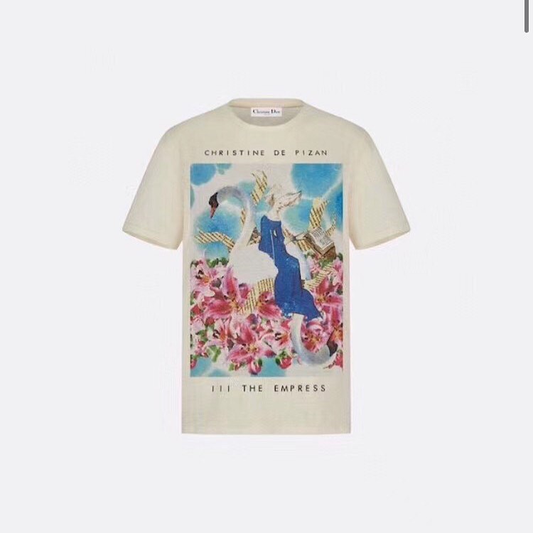 Эта женская футболка Christian Dior LUX-33160 представляет собой элегантный предмет одежды в стиле кэжуал. Футболка украшена художественным принтом, вдохновленным образом "The Empress" и цитатой Кристины Пизанской, что добавляет ей уникальности и глубины. Классический крой и нейтральный цвет делают ее универсальной основой для множества образов.