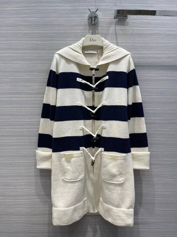 Данный кардиган Christian Dior LUX-55248 представляет собой стильную модель в морском стиле. Изделие выполнено в классическом сочетании белоснежного и темно-синего цветов, дополненном характерными для этого бренда элементами. Удлиненный крой и удобный капюшон делают его практичным выбором для прохладной погоды.