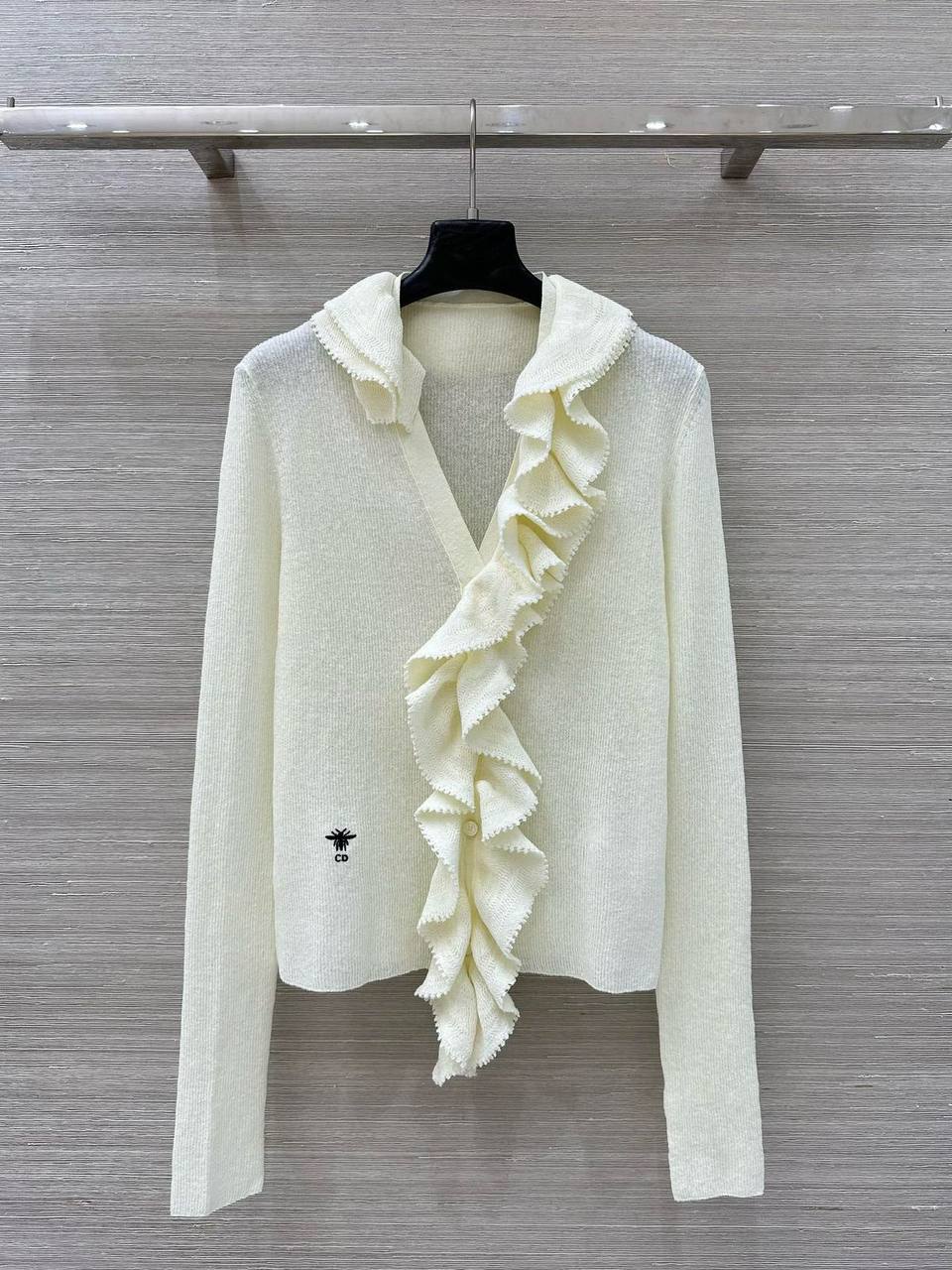 Этот кардиган Christian Dior LUX-126734 - изысканный предмет гардероба, сочетающий в себе элегантность и комфорт. Кардиган выполнен в нежном белом цвете и украшен изящными рюшами.