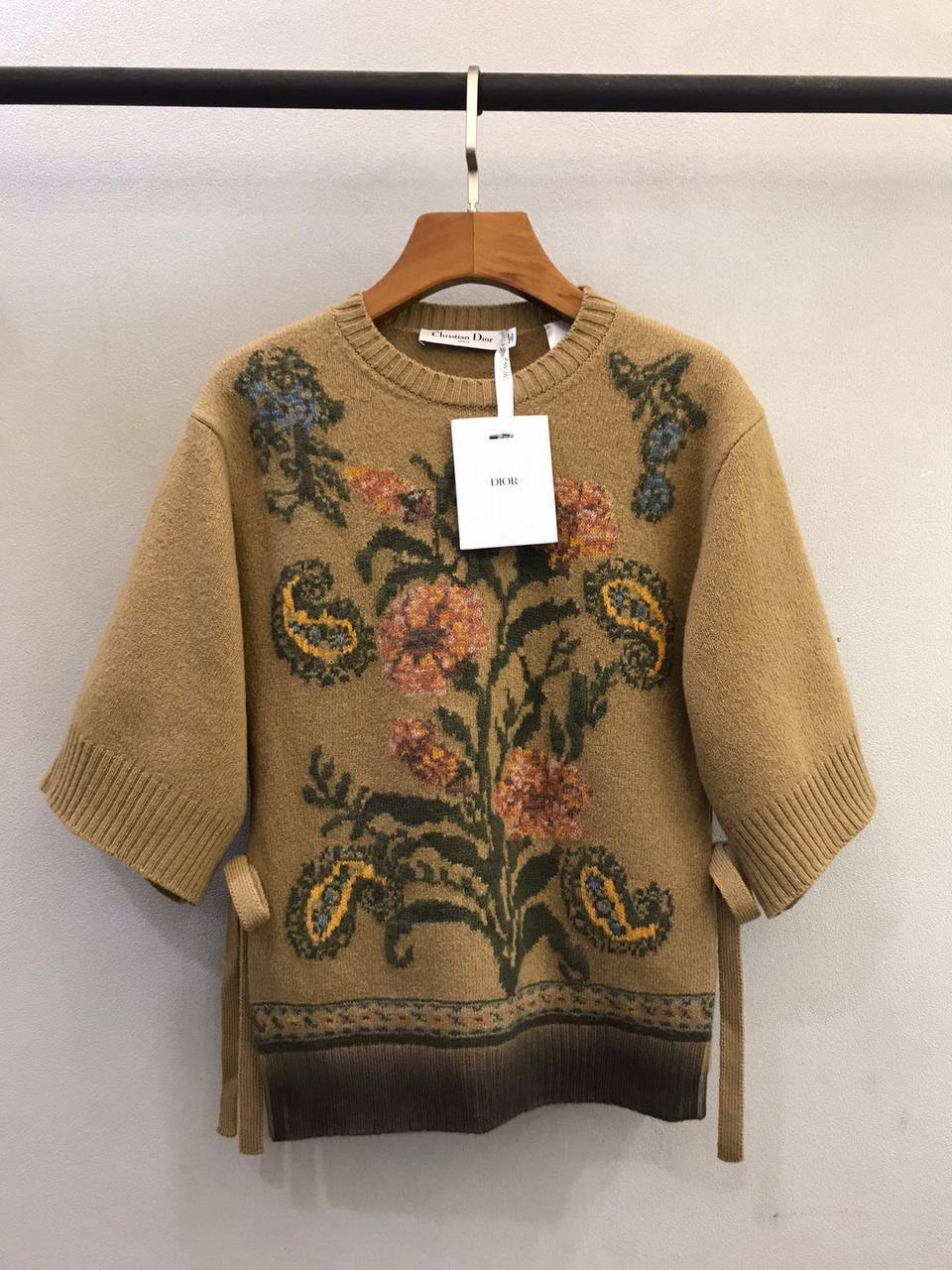 Кофта Christian Dior LUX-76230 представляет собой стильный предмет гардероба. Кофта выполнена в классическом стиле, с круглым вырезом и короткими рукавами. Преобладающий цвет - светло-коричневый, украшен яркими цветочными узорами.
