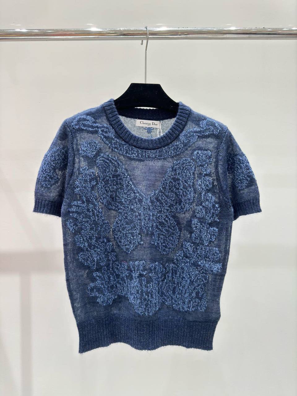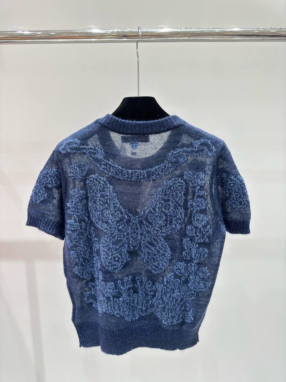 Кофта Christian Dior LUX-104533 представляет собой элегантный предмет гардероба. Кофта выполнена в классическом стиле, с круглым вырезом и короткими рукавами. Основной цвет изделия — темно-синий, с контрастным узором, создающим интересный визуальный эффект.