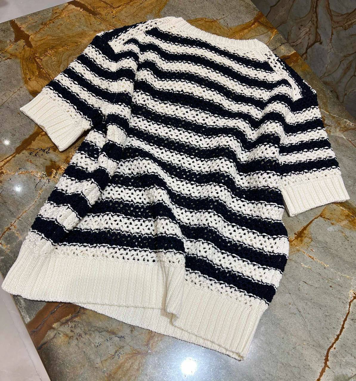 Кофта Christian Dior LUX-105181 – это стильный предмет гардероба, представляющий собой сочетание элегантности и комфорта. Изделие выполнено в полосатом дизайне, сочетающем белый и тёмно-синий цвета, что придает ему свежий и запоминающийся вид. Кофта, идеально подходящая для создания модных образов, выполнена в современном стиле, с акцентом на логотип бренда.