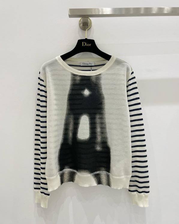 Кофта Christian Dior LUX-105489 выполнена в повседневном стиле. Кофта имеет белый цвет с черным принтом в виде рисунка и полосатыми рукавами. Идеально подходит для создания стильных образов на каждый день.