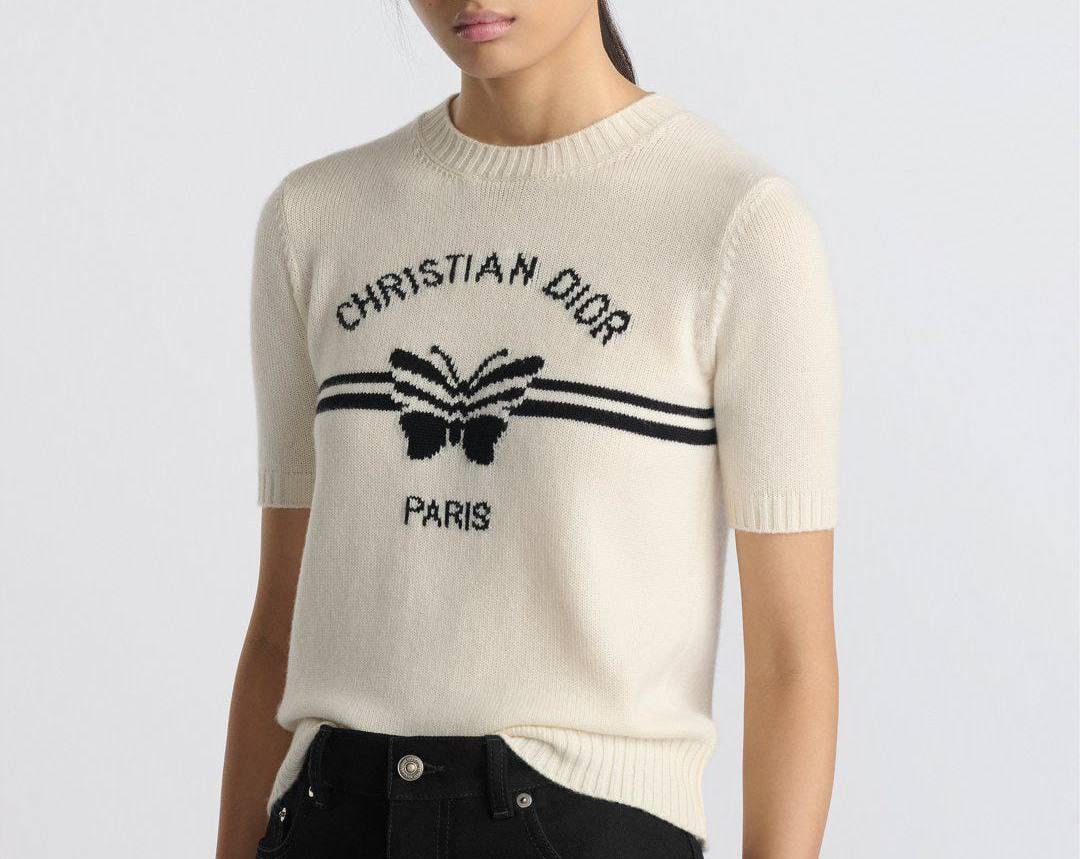 Кофта Christian Dior LUX-116683 – это стильный предмет гардероба в стиле кэжуал. Она выполнена в кремовом цвете, имеет короткие рукава и украшена черным принтом с изображением бабочки и надписью "Paris". Такая кофта идеально подходит для создания повседневных образов.
