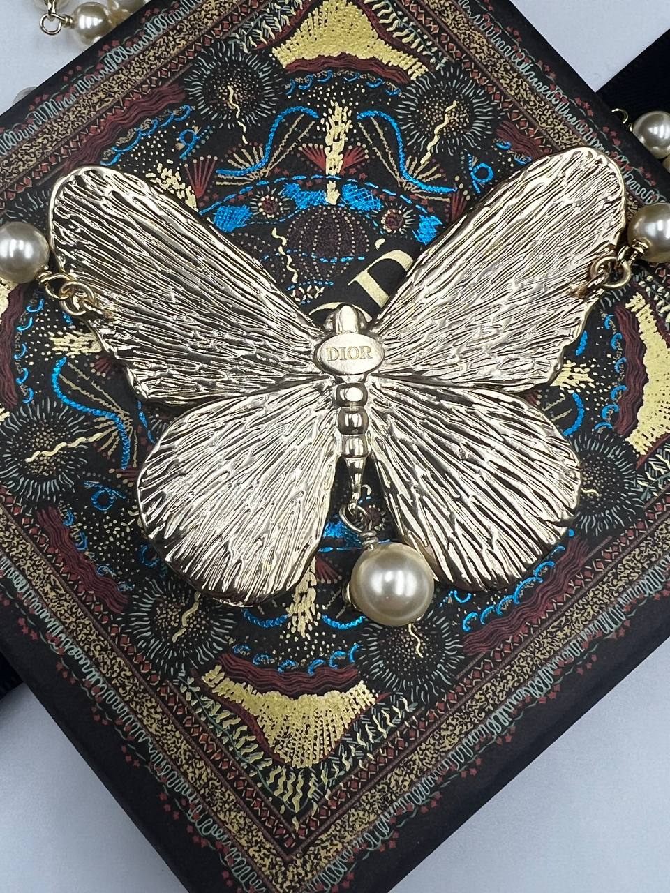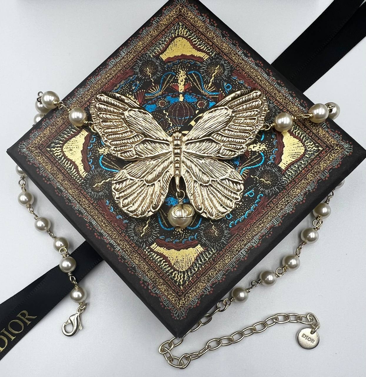 Колье Christian Dior LUX-106056 – изысканное украшение, которое станет ярким акцентом в вашем образе. Колье выполнено в золотистом цвете с элементами жемчужин и подвеской в виде бабочки. Оно идеально подойдет для создания как повседневных, так и вечерних образов.