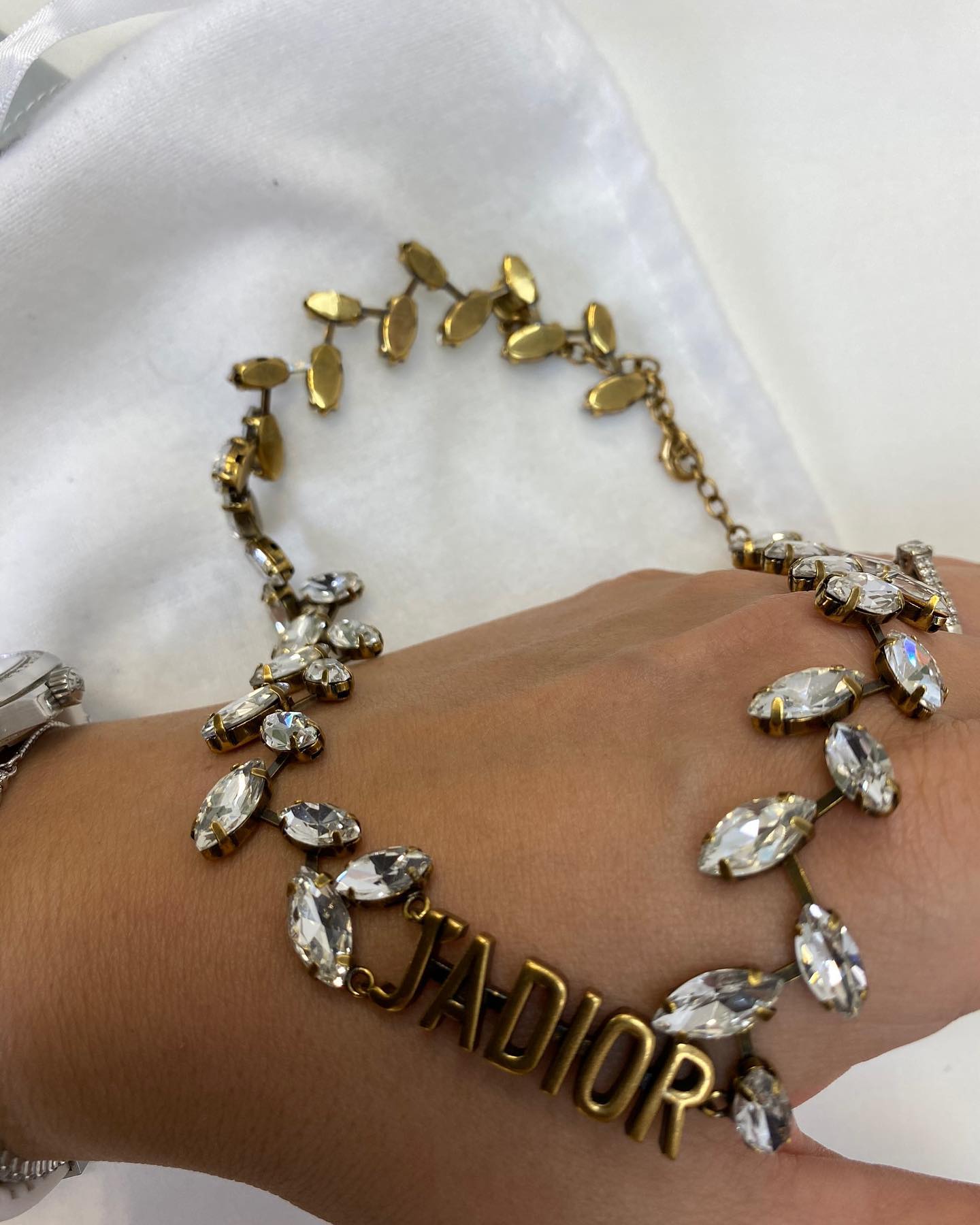 Колье Christian Dior LUX-34060 представляет собой изысканное ювелирное украшение, выполненное в элегантном стиле. Дизайн колье напоминает веточку с листьями, инкрустированную мерцающими кристаллами, и дополнено золотистой надписью "J`ADIOR". Это произведение искусства от Christian Dior подчеркнет ваш утонченный вкус и добавит роскоши любому образу, идеально подходя для особых случаев или как акцент для вечернего наряда.