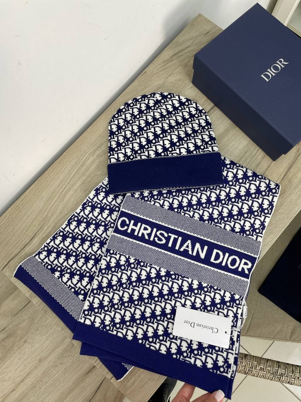 Комплект Christian Dior LUX-61335 представляет собой стильный и элегантный аксессуар, выполненный в узнаваемом дизайне бренда. Набор включает шапку и шарф, украшенные фирменным узором Dior Oblique в синем и белом цветах. Этот комплект идеально подходит для создания завершенного образа в холодное время года, добавляя роскоши и утонченности.