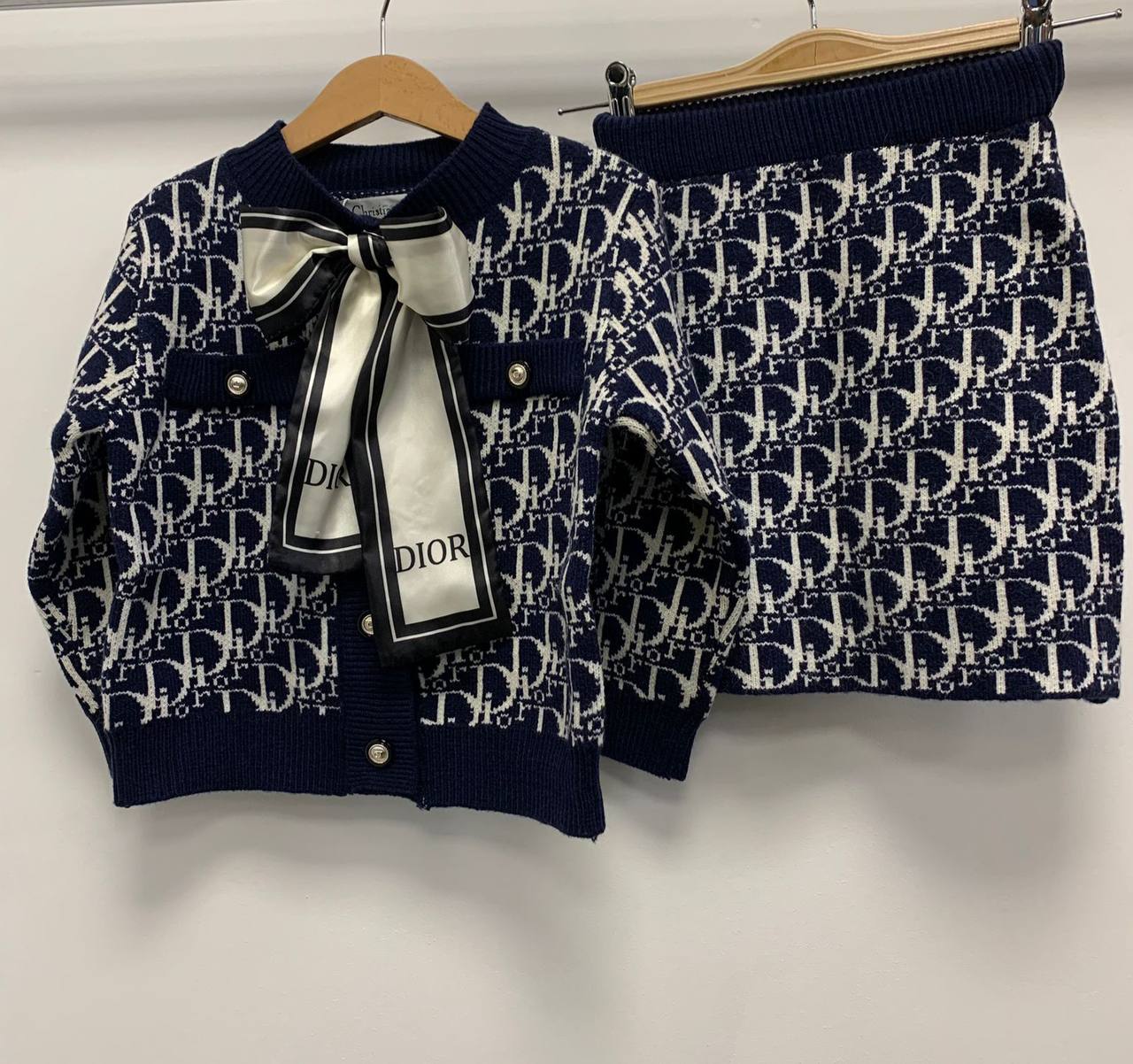 Комплект Christian Dior LUX-73877 — это воплощение изысканности и стиля. Комплект состоит из кардигана и юбки, выполненных в темно-синем цвете с узнаваемым монохромным узором. Этот комплект, подойдет для создания как повседневных, так и более элегантных образов.