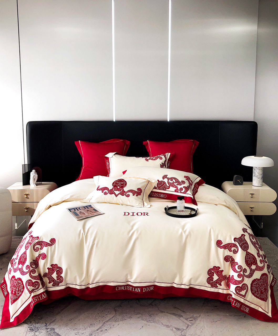 Комплект постельного белья Christian Dior LUX-96342 выполнен в элегантном стиле. Основной цвет - кремовый, дополненный ярким красным акцентом в виде узора и окантовки. Предназначен для создания атмосферы роскоши и комфорта в спальне.