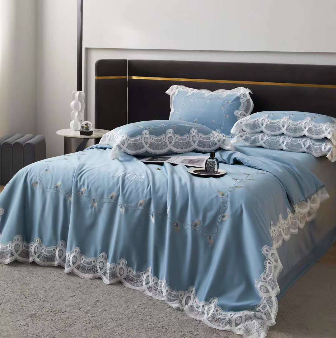 Комплект постельного белья Christian Dior LUX-97803 представляет собой элегантный набор для спальни, выполненный в нежно-голубом цвете. Постельное белье украшено белым кружевным декором по краям и вышивкой. Такой комплект станет прекрасным дополнением для любой спальни, создавая атмосферу уюта и роскоши.