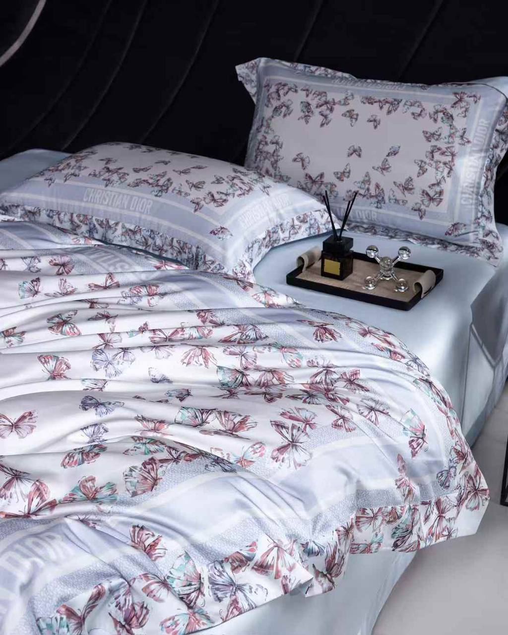 Комплект постельного белья Christian Dior – это изысканный выбор для тех, кто ценит роскошь и стиль в каждой детали. Белье выполнено в нежных тонах и украшено узором с бабочками, что придает спальне атмосферу легкости и свежести.
