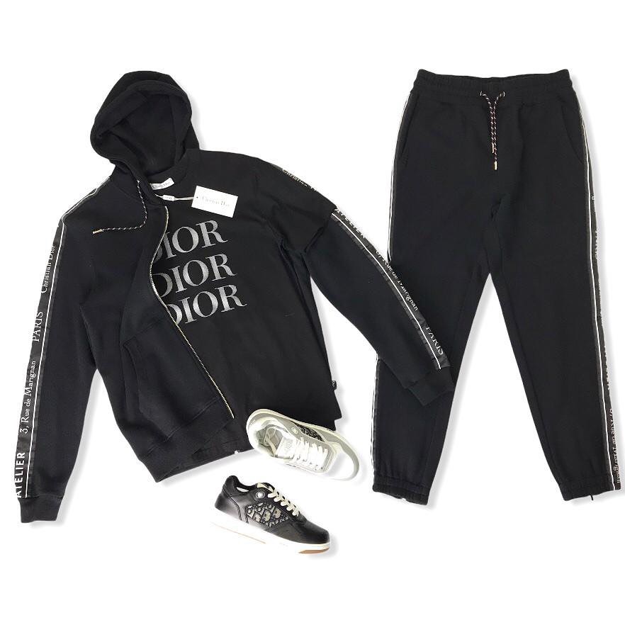 Костюм Christian Dior LUX-44654 представляет собой стильный и современный комплект, выполненный в спортивном стиле. Комплект состоит из черной толстовки с капюшоном и брюк, украшенных контрастной тесьмой с надписями. На толстовке расположен крупный логотип бренда, а на рукавах и штанинах - брендированная лента с адресом "3, Rue de Marignan, Paris" и надписью "Christian Dior".
