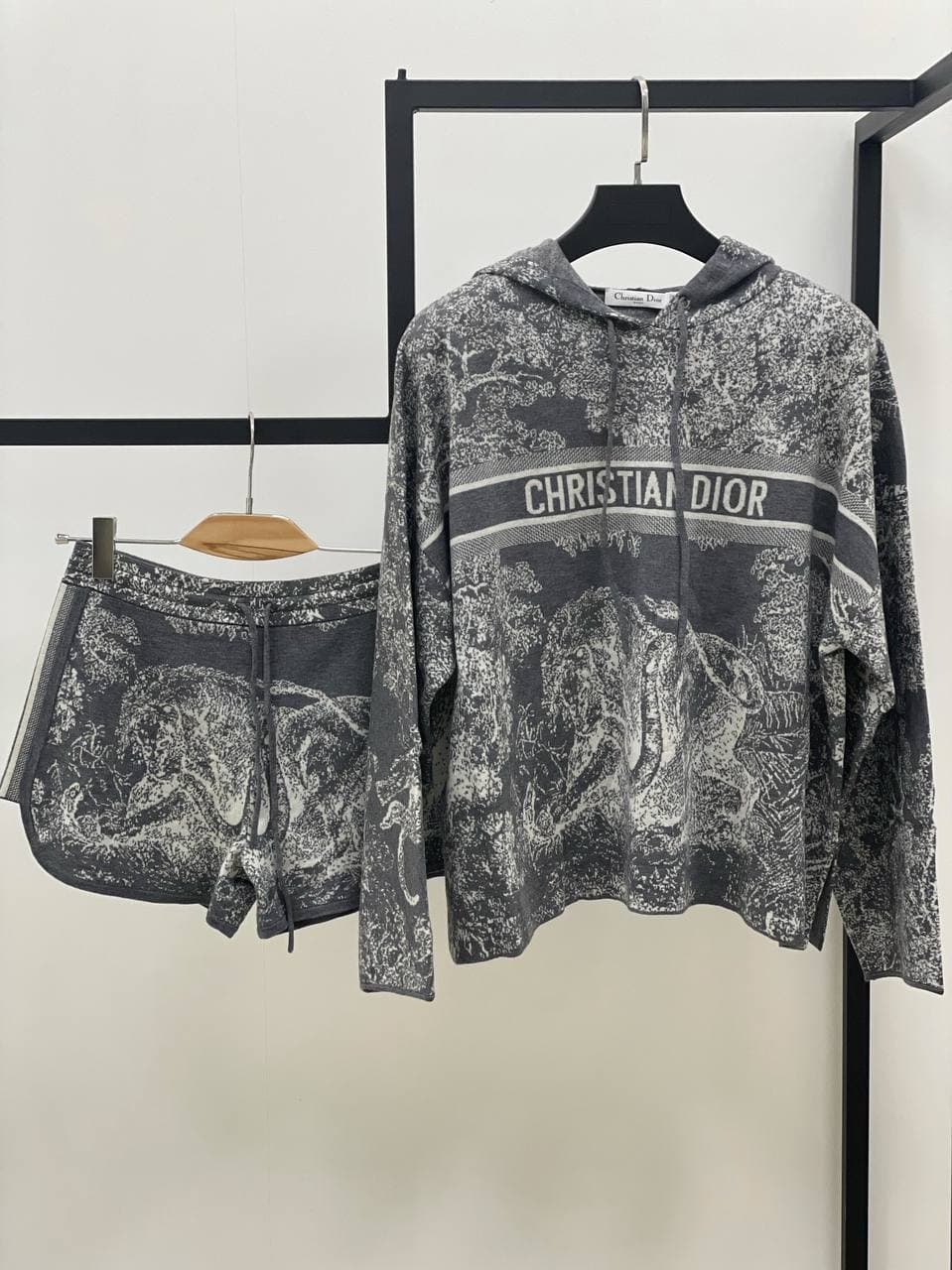 Представлен изысканный костюм Christian Dior LUX-53160, сочетающий в себе стиль и комфорт. Этот комплект, состоящий из худи и шорт, декорирован уникальным принтом в стиле "джунгли" с изображением животных, что придает ему особую выразительность. Оригинальный дизайн делает его идеальным выбором для создания модного и запоминающегося образа.