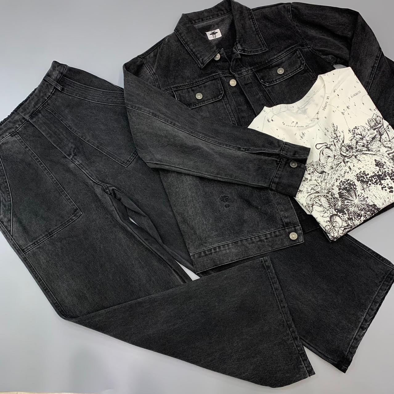 Представленный костюм Christian Dior LUX-44435 — это стильный и современный выбор для тех, кто ценит комфорт и элегантность. Комплект, состоящий из джинсовой куртки и брюк, выполнен в темных тонах, что придает ему универсальность и легкость в сочетании с другими элементами гардероба. Дизайн сочетает в себе классические элементы джинсовой одежды с модными акцентами.