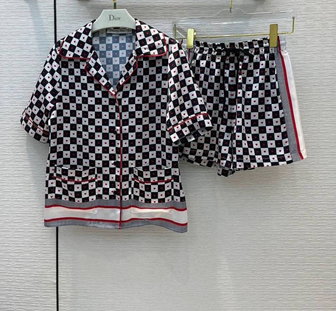 Представленный товар - это стильный костюм Christian Dior LUX-55655, состоящий из рубашки и шорт. Дизайн выполнен в оригинальном стиле, сочетающем классическую клетку с милым принтом в виде сердечек, что придает изделию игривости и элегантности. Этот комплект идеально подойдет для дома, обеспечивая комфорт и непревзойденный вид.